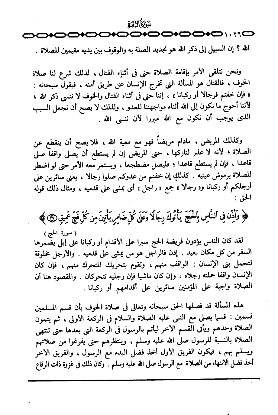 وكذلك المريض، مادام مريضاً فهو مع معية الله، فلا يصح أن ينقطع عن الصلاة؛ لأنه لا عذر لتاركها، حتى المريض إن لم يستطع أن يصلي واقفا صلى قاعداً، فإن لم يستطع قاعدا؛ فليصل مضطجعا، ويستمر معه الأمر حتى لو اضطر للصلاة برموش عينيه. كذلك إن خفتم من عدوكم صلوا رجالا، يعني سائرين على أرجلكم أو ركبانا و «رجالا» جمع «راجل» أي يمشي على قدميه، ومثال ذلك قوله الحق: {وَأَذِّن فِي الناس بالحج يَأْتُوكَ رِجَالاً وعلى كُلِّ ضَامِرٍ يَأْتِينَ مِن كُلِّ فَجٍّ عَميِقٍ} [الحج: 27] لقد كان الناس يؤدون فريضة الحج سيراً على الأقدام أو ركباناً على إبل يضمرها السفر من كل مكان بعيد. إذن فالراجل هو من يمشي على قدميه.