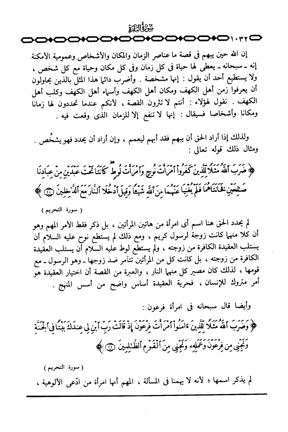 ولذلك إذا أراد الحق أن يبهم فقد أبهم ليعمم، وإن أراد أن يحدد فهو يشخِّص ومثال ذلك قوله تعالى: {ضَرَبَ الله مَثَلاً لِّلَّذِينَ كَفَرُواْ امرأت نُوحٍ وامرأت لُوطٍ كَانَتَا تَحْتَ عَبْدَيْنِ مِنْ عِبَادِنَا صَالِحَيْنِ فَخَانَتَاهُمَا فَلَمْ يُغْنِيَا عَنْهُمَا مِنَ الله شَيْئاً وَقِيلَ ادخلا النار مَعَ الداخلين} [التحريم: 10]