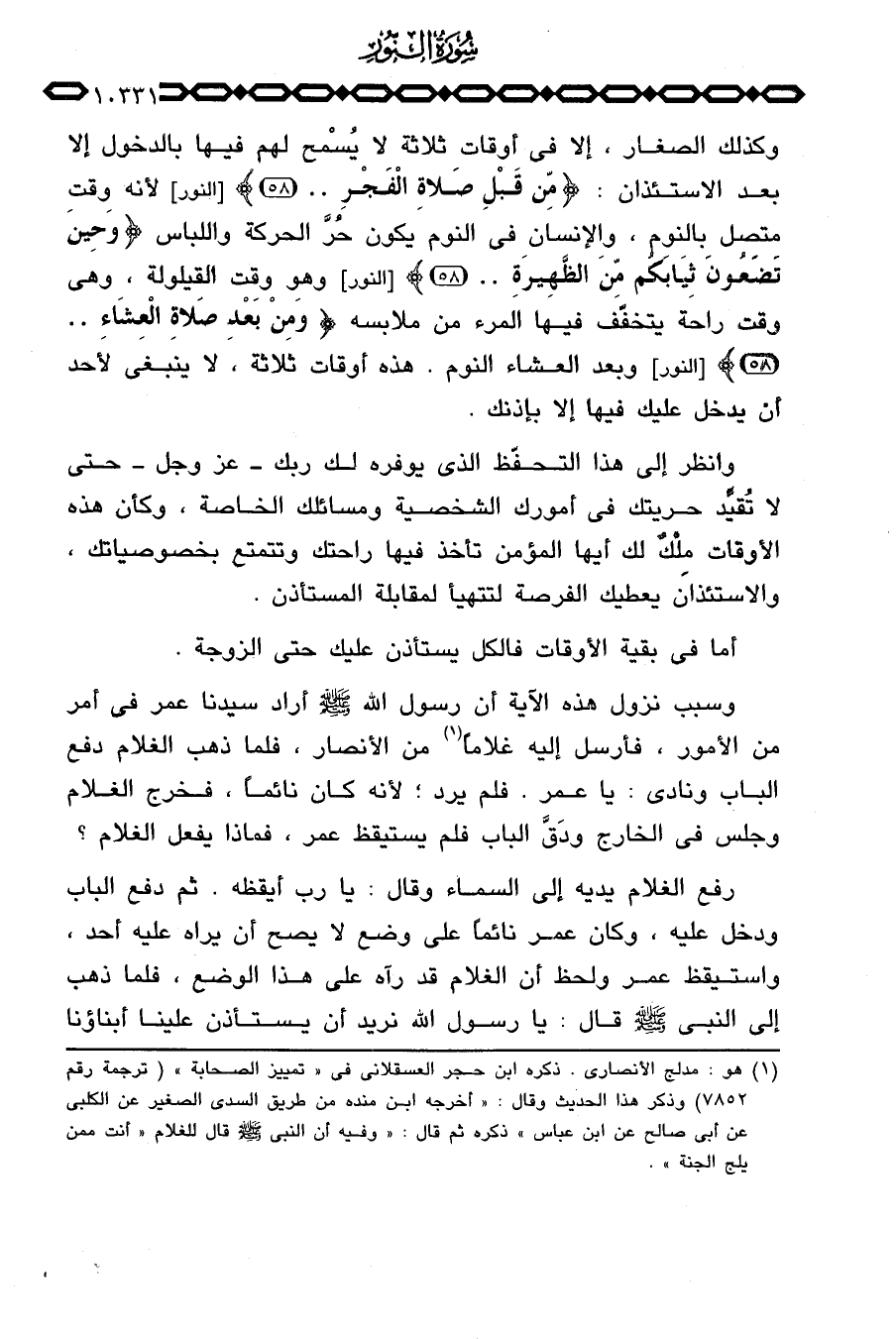 وكذلك الصغار، إلا في أوقات ثلاثة لا يُسْمح لهم فيها بالدخول إلا بعد الاستئذان: {مِّن قَبْلِ صلاوة الفجر} [النور: 58] لأنه وقت متصل بالنوم، والإنسان في النوم يكون حُرَّ الحركة واللباس {وَحِينَ تَضَعُونَ ثيابكم مِّنَ الظهيرة} [النور: 58] وهو وقت القيلولة، وهي وقت راحة يتخفّف فيها المرء من ملابسه {وَمِن بَعْدِ صلاوة العشآء} [النور: 58] وبعد العشاء النوم.