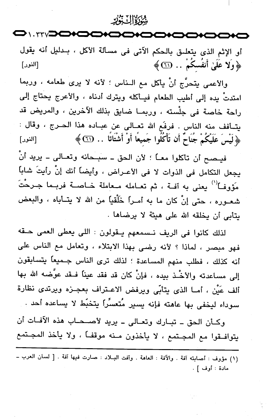 فيصح أن تأكلوا معاً؛ لأن الحق سبحانه وتعالى يريد أنْ يجعل التكامل في الذوات لا في الأعراض، وأيضاً أنك إنْ رأيتَ شاباً مَؤوفاً يعني به آفة، ثم تعامله معاملة خاصة فربما جرحْتَ شعوره، حتى إنْ كان ما به أمراً خَلْقياً من الله لا يتأباه، والبعض يتأبى أن يخلقه الله على هيئة لا يرضاها.