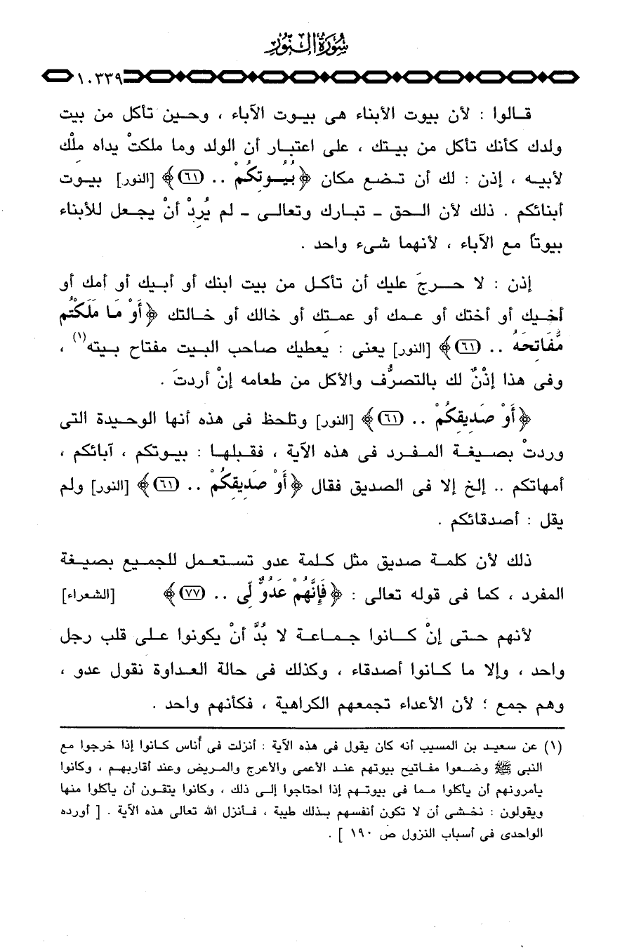 {أَوْ صَدِيقِكُمْ} [النور: 61] ٍ وتلحظ في هذه أنها الوحيدة التي وردتْ بصيغة المفرد في هذه الآية، فقبلها: بيوتكم، آباءكم، أمهاتكم. . إلخ إلا في الصديق فقال {أَوْ صَدِيقِكُمْ} [النور: 61] ولم يقل: أصدقائكم.