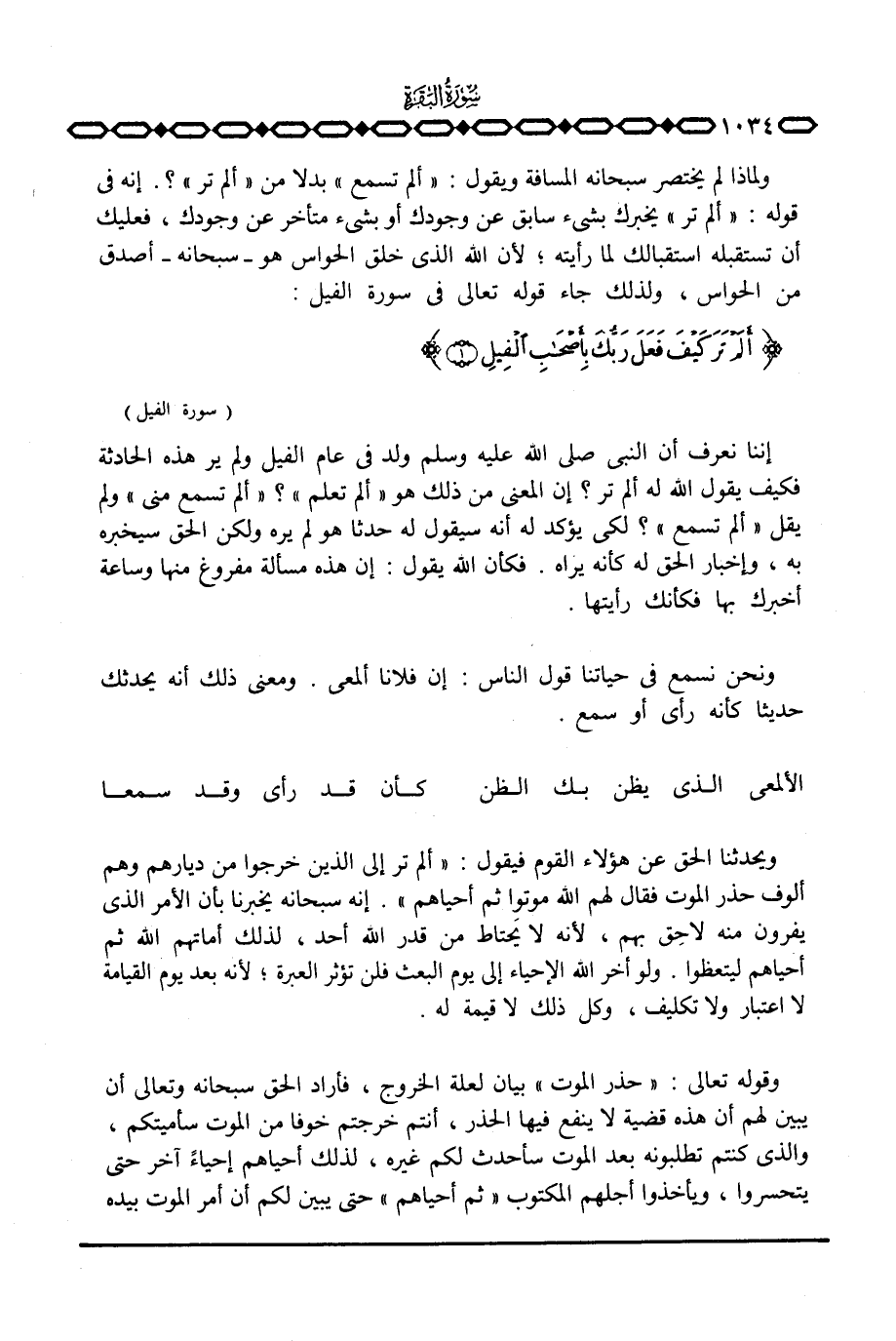 ولماذا لم يختصر سبحانه المسافة ويقول: «ألم تسمع» بدلا من {أَلَمْ تَرَ} ؟ . إنه في قوله: {أَلَمْ تَرَ} يخبرك بشيء سابق عن وجودك أو بشيء متأخر عن وجودك، فعليك أن تستقبله استقبالك لما رأيته؛ لأن الله الذي خلق الحواس هو سبحانه أصدق من الحواس، ولذلك جاء قوله تعالى في سورة الفيل: {أَلَمْ تَرَ كَيْفَ فَعَلَ رَبُّكَ بِأَصْحَابِ الفيل} [الفيل: 1]