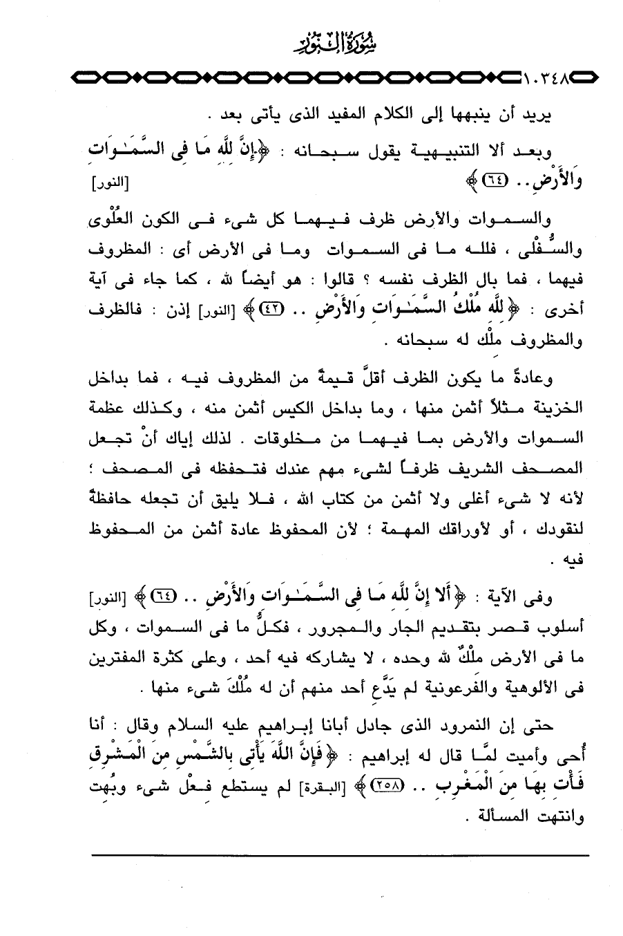وعادةً ما يكون الظرف أقلَّ قيمةً من المظروف فيه، فما بداخل الخزينة مثلاً أثمن منها، وما بداخل الكيس أثمن منه، وكذلك عظمة السموات والأرض بما فيهما من مخلوقات. لذلك إياك أنّْ تجعل المصحف الشريف ظرفاً لشيء مهم عندك فتحفظه في المصحف؛ لأنه لا شيء أغلى ولا أثمن من كتاب الله، فلا يليق أن تجعله حافظةً لنقودك، أو لأوراقك المهمة؛ لأن المحفوظ عادة أثمن من المحفوظ فيه.