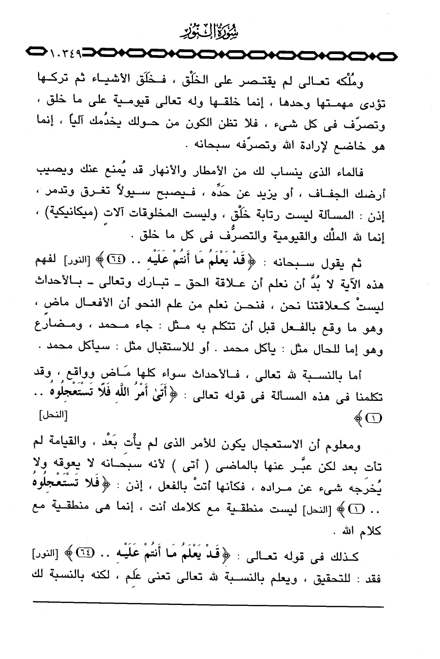 ثم يقول سبحانه: {قَدْ يَعْلَمُ مَآ أَنتُمْ عَلَيْهِ} [النور: 64] لفهم هذه الآية لا بُدَّ أن نعلم أن علاقة الحق تبارك وتعالى بالأحداث ليستْ كعلاقتنا نحن، فنحن نعلم من علم النحو أن الأفعال ماضٍ، وهو ما وقع بالفعل قبل أن تتكلم به مثل: جاء محمد، ومضارع وهو إما للحال مثل: يأكل محمد. أو للاستقبال مثل: سيأكل محمد.