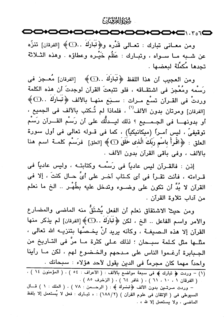 ومن العجيب أن هذا اللفظ {تَبَارَكَ} [الفرقان: 1] مُعجز في رَسْمه ومُعْجز في اشتقاقه، فلو تتعبتَ القرآن لوجدتَ أن هذه الكلمة وردتْ في القرآن تسْع مرات: سبع منها بالألف {تَبَارَكَ} [الفرقان: 1] ومرتان بدون الألف، فلماذا لم تُكتب بالألف في الجميع، أو بدونها في الجميع؟ ذلك ليدلُّك على أن رَسْم القرآن رَسْم توقيفيّ، ليس أمراً (ميكانيكياً) ، كما في قوله تعالى في أول سورة العلق: {اقرأ باسم رَبِّكَ الذي خَلَقَ} [العلق: 1] فرَسْم كلمة اسم هنا بالألف، وفي باقي القرآن بدون الألف.