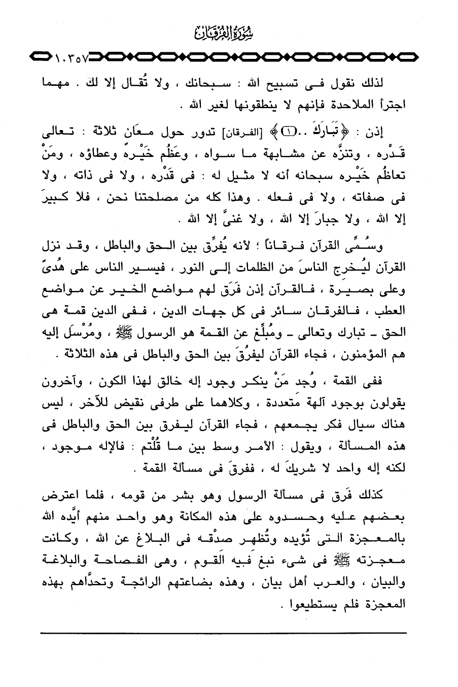 وسُمِّي القرآن فرقاناً؛ لأنه يُفرِّق بين الحق والباطل، وقد نزل القرآن ليُخرج الناسَ من الظلمات إلى النور، فيسير الناس على هُدىً وعلى بصيرة، فالقرآن إذن فَرَق لهم مواضع الخير عن مواضع العطب، فالفرقان سائر في كل جهات الدين، ففي الدين قمة هي الحق تبارك وتعالى ومُبلِّغ عن القمة هو الرسول صَلَّى اللَّهُ عَلَيْهِ وَسَلَّم َ، ومُرْسَل إليه هم المؤمنون، فجاء القرآن ليفرُقَ بين الحق والباطل في هذه الثلاثة.