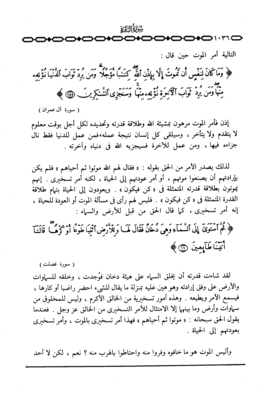 التالية أمر الموت حين قال: {وَمَا كَانَ لِنَفْسٍ أَنْ تَمُوتَ إِلاَّ بِإِذْنِ الله كِتَاباً مُّؤَجَّلاً وَمَن يُرِدْ ثَوَابَ الدنيا نُؤْتِهِ مِنْهَا وَمَن يُرِدْ ثَوَابَ الآخرة نُؤْتِهِ مِنْهَا وَسَنَجْزِي الشاكرين} [آل عمران: 145]