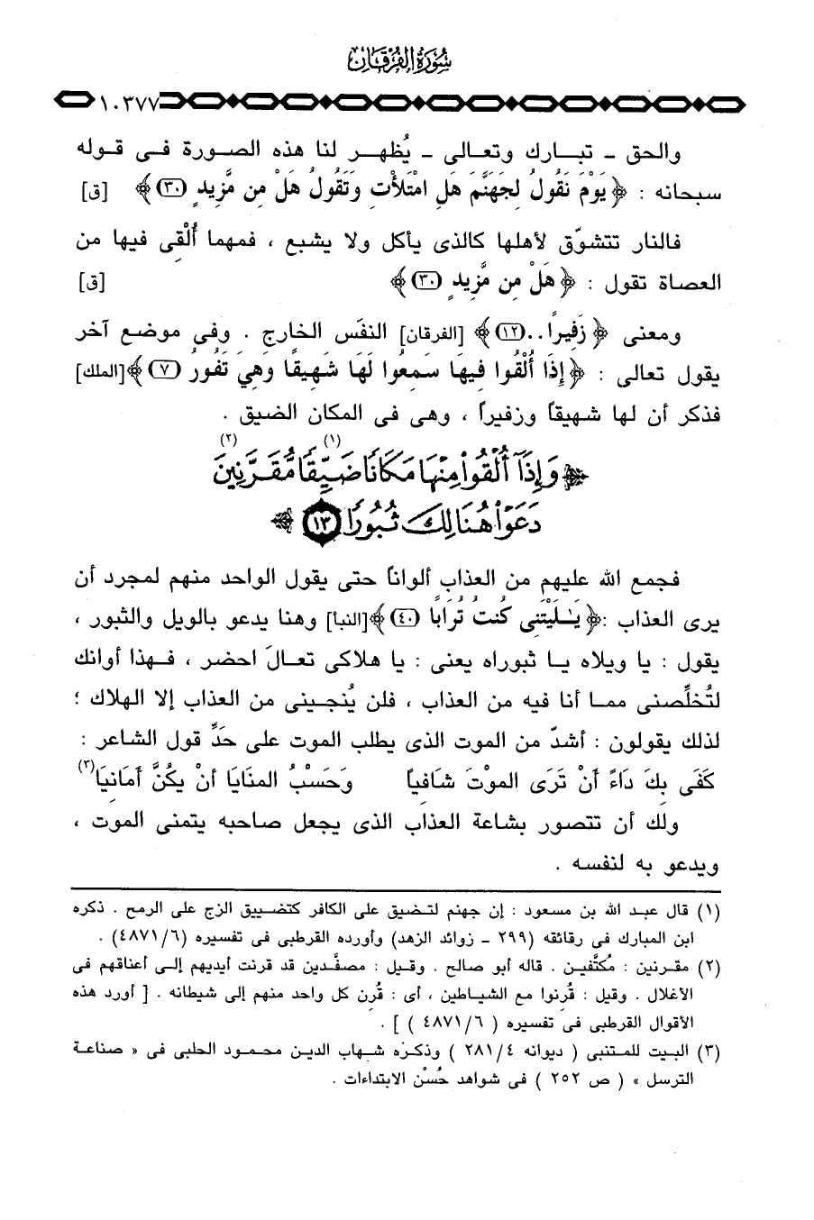 ومعنى {وَزَفِيراً} [الفرقان: 12] النفَس الخارج. وفي موضع آخر يقول تعالى: {إِذَآ أُلْقُواْ فِيهَا سَمِعُواْ لَهَا شَهِيقاً وَهِيَ تَفُورُ} [الملك: 7] فذكر أن لها شهيقاً وزفيراً، وهي في المكان الضيق.