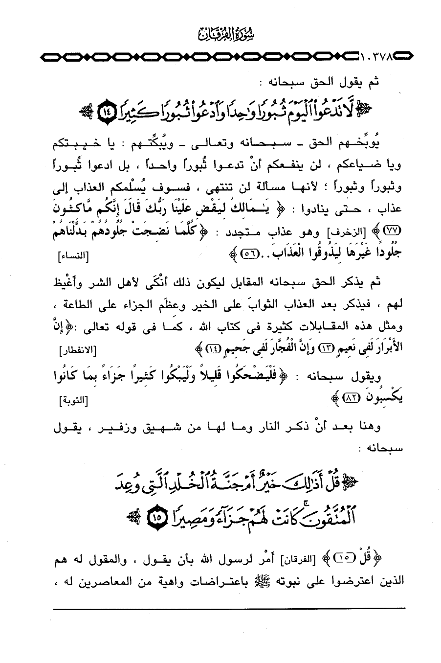 يُوبِّخهم الحق سبحانه وتعالى ويُبكِّتهم: يا خيبتكم ويا ضياعكم، لن ينفعكم أنْ تدعوا ثُبوراً واحداً، بل ادعوا ثُبوراً وثبوراً وثبوراً؛ لأنها مسألة لن تنتهي، فسوف يُسْلِمكم العذاب إالى عذاب، حتى ينادوا: {يامالك لِيَقْضِ عَلَيْنَا رَبُّكَ قَالَ إِنَّكُمْ مَّاكِثُونَ} [الزخرف: 77] وهو عذاب متجدد: {كُلَّمَا نَضِجَتْ جُلُودُهُمْ بَدَّلْنَاهُمْ جُلُوداً غَيْرَهَا لِيَذُوقُواْ العذاب} [النساء: 56] .