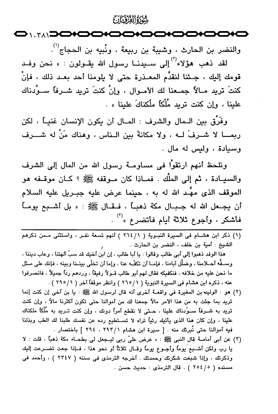 ونلحظ أنهم ارتقوْا في مساومة رسول الله من المال إلى الشرف والسيادة، ثم إلى الملْك. فماذا كان موقفه صَلَّى اللَّهُ عَلَيْهِ وَسَلَّم َ؟ كان موقفه هو الموقف الذي مهَّد الله له به، حينما عرض عليه جبريل عليه السلام أن يجعل الله له جبال مكة ذهباً، فقال صَلَّى اللَّهُ عَلَيْهِ وَسَلَّم َ: «بل أشبع يوماً فأشكر، وأجوع ثلاثة أيام فأتضرع» .