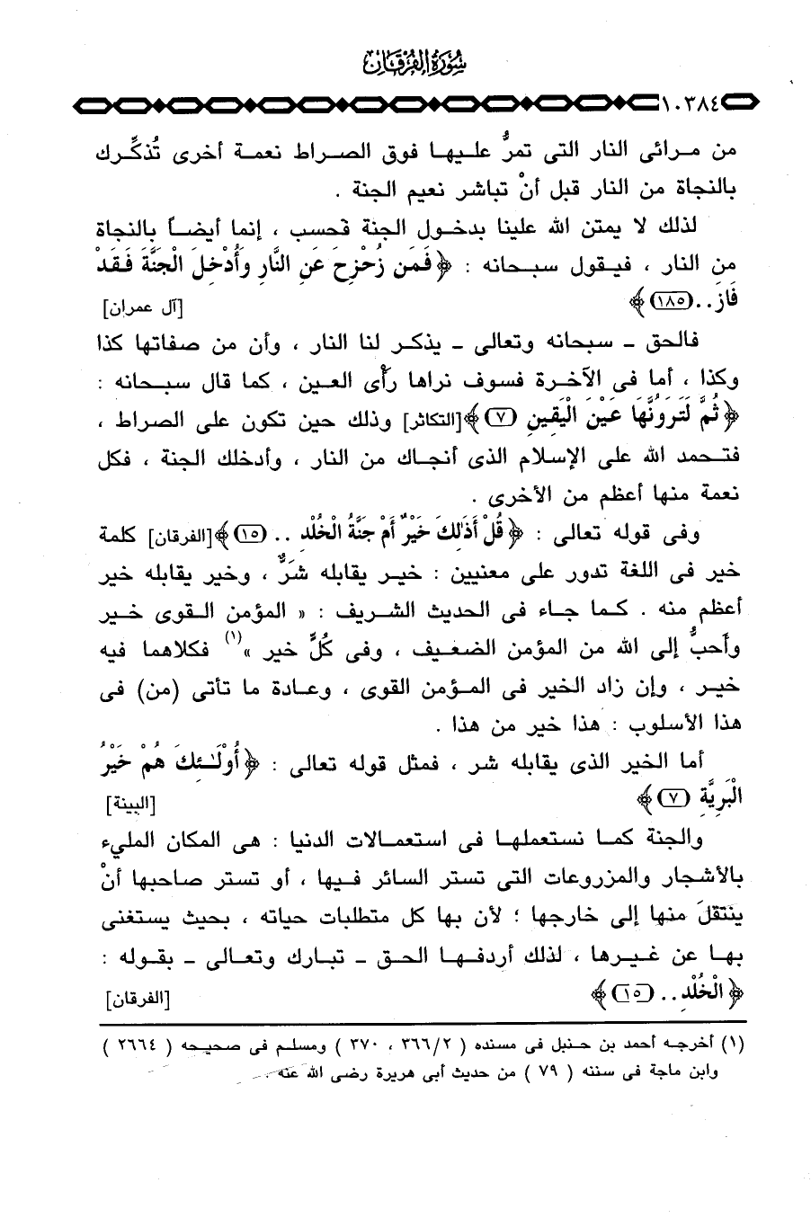 وفي قوله تعالى: {قُلْ أذلك خَيْرٌ أَمْ جَنَّةُ الخلد} [الفرقان: 15] كلمة خير في اللغة تدور على معنيين: خير يقابله شَرٌّ، وخير يقابله خير أعظم منه. كما جاء في الحديث الشريف: «المؤمن القوي خير وأَحبُّ إلى الله من المؤمن الضعيف، وفي كُلٍّ خير» فكلاهما فيه خير، وإن زاد الخير في المؤمن القوي، وعادة ما تأتي (من) في هذا الأسلوب: هذا خير من هذا.