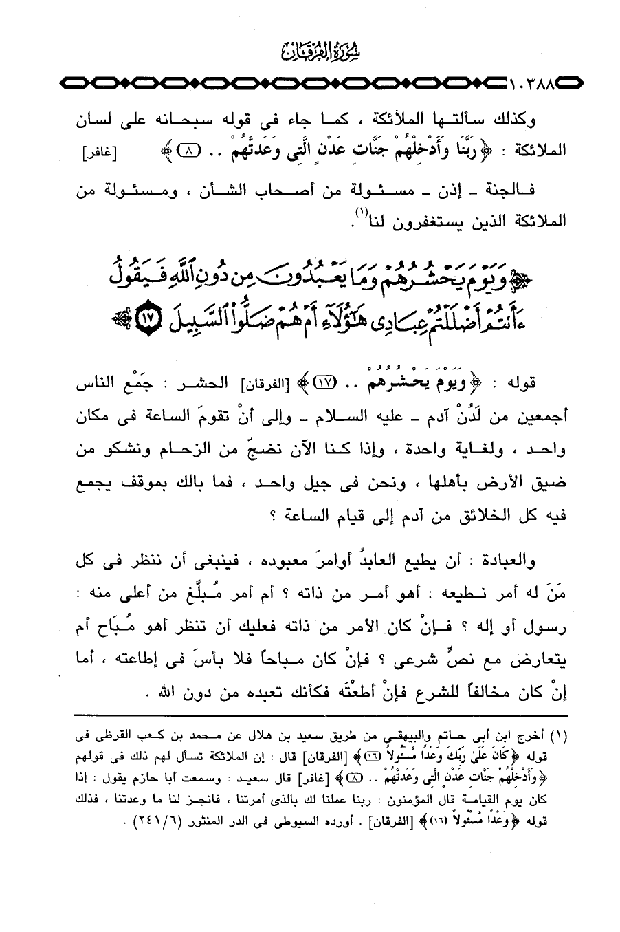 قوله: {وَيَوْمَ يَحْشُرُهُمْ} [الفرقان: 17] الحشر: جَمْع الناس أجمعين من لَدُنْ آدم عليه السلام وإلى أنْ تقومَ الساعة في مكان واحد، ولغاية واحدة، وإذا كنا الآن نضجّ من الزحام ونشكو من ضيق الأرض بأهلها، ونحن في جيل واحد، فما بالك بموقف يجمع فيه كل الخلائق من آدم إلى قيام الساعة؟