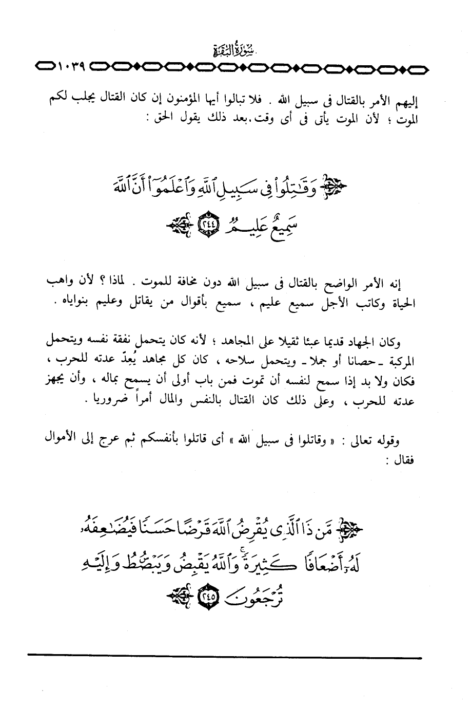 إنه الأمر الواضح بالقتال في سبيل الله دون مخافة للموت. لماذا؟ لأن واهب الحياة وكاتب الأجل سميع عليم، سميع بأقوال من يقاتل وعليم بنواياه.
