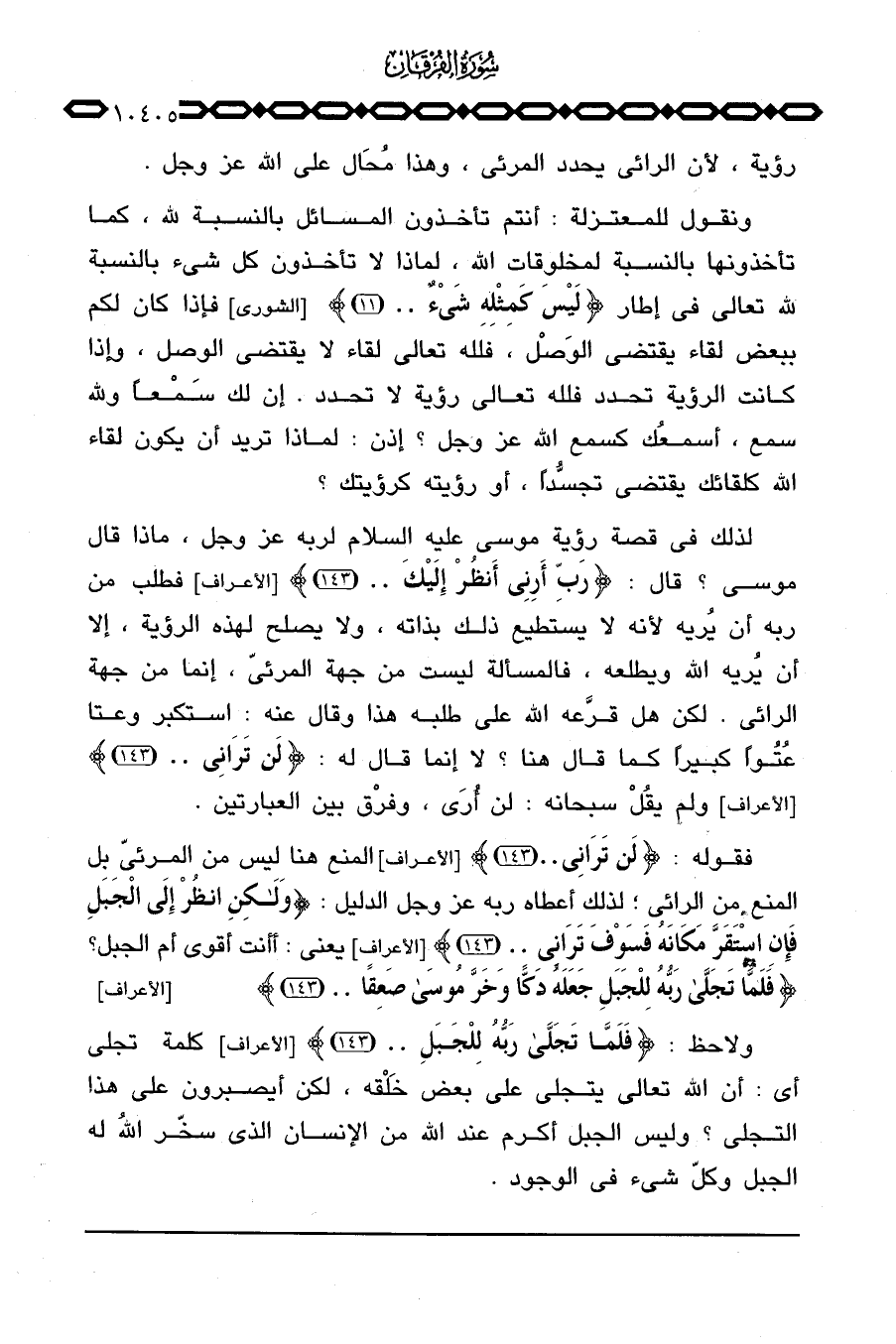 لذلك في قصة رؤية موسى عليه السلام لربه عَزَّ وَجَلَّ، ماذا قال موسى؟ قال: {رَبِّ أرني أَنظُرْ إِلَيْكَ} [الأعراف: 143] فطلب من ربه أن يُريه لأنه لا يستطيع ذلك بذاته، ولا يصلح لهذه الرؤية، ألا أن يُريه الله ويطلعه، فالمسألة ليست من جهة المرئيّ، إما من جهة الرائي. لكن هل قرَّعه الله على طلبه هذا وقال عنه: استكبر وعتا عُتُواً كبيراً كما قال هنا؟ لا إنما قال له: {لَن تَرَانِي} [الأعراف: 143] ولم يقُلْ سبحانه: لن أُرَى، وفرْق بين العبارتين.