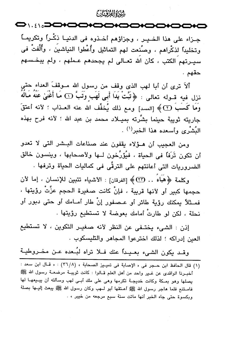 ألاَ ترى أن أبا لهب الذي وقف من رسول الله موقِفَ العداء حتى نزل فيه قوله تعالى: {تَبَّتْ يَدَآ أَبِي لَهَبٍ وَتَبَّ مَآ أغنى عَنْهُ مَالُهُ وَمَا كَسَبَ} [المسد: 12] ومع ذلك يُخفِّف الله عنه العذاب؛ لأنه أعتقَ جاريته ثويبة حينما بشَّرته بميلاد محمد بن عبد الله؛ لأنه فرح بهذه البُشْرى وأسعده هذا الخبر.