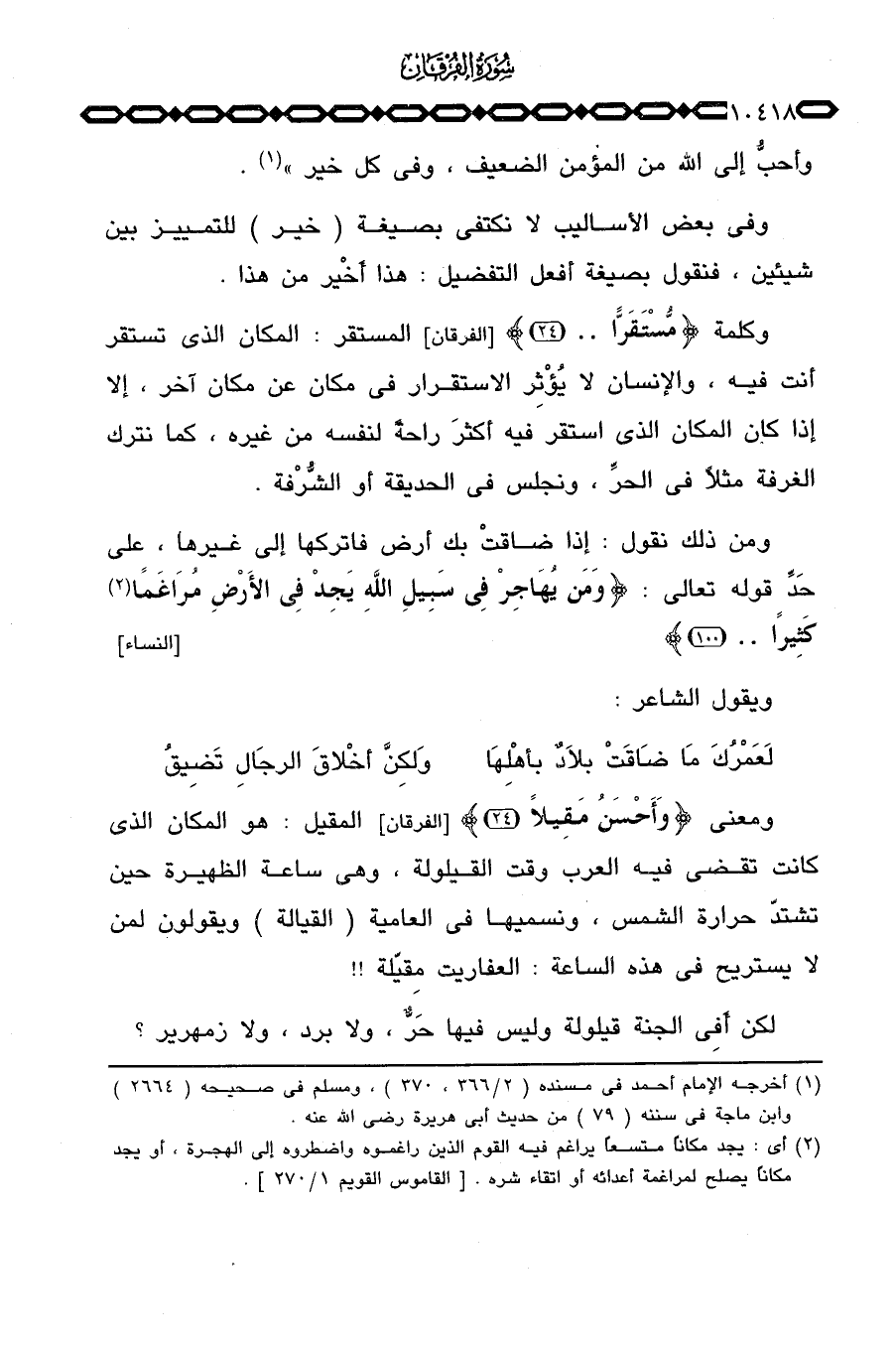 ومعنى {وَأَحْسَنُ مَقِيلاً} [الفرقان: 24] المقيل: هو المكان الذي كانت تقضي فيه العرب وقت القيلولة، وهي ساعة الظهيرة حين تشتدّ حرارة الشمس، ونسميها في العامية (القيالة) ويقولون لمن لا يستريح في هذه الساعة: العفاريت مِقيّلة!!