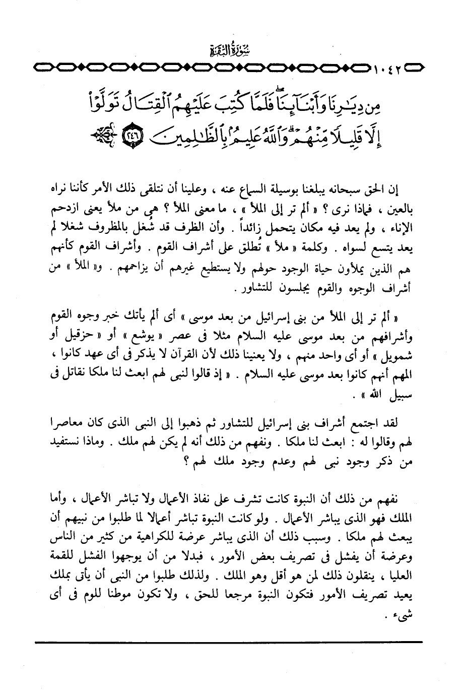 إن الحق سبحانه يبلغنا بوسيلة السماع عنه، وعلينا أن نتلقى ذلك الأمر كأننا نراه بالعين، فماذا نرى؟ {أَلَمْ تَرَ إِلَى الملإ} ، ما معنى الملأ؟ هي من ملأ يعني ازدحم الإناء، ولم يعد فيه مكان يتحمل زائداً. وأن الظرف قد شُغل بالمظروف شغلا لم يعد يتسع لسواه. وكلمة «ملأ» تُطلق على أشراف القوم كأنهم هم الذين يملأون حياة الوجود حولهم ولا يستطيع غيرهم أن يزاحمهم. و {الملإ} من أشراف الوجوه والقوم يجلسون للتشاور. {أَلَمْ تَرَ إِلَى الملإ مِن بني إِسْرَائِيلَ مِن بَعْدِ موسى} أي ألم يأتك خبر وجوه القوم وأشرافهم من بعد موسى عليه السلام مثلا في عصر «يوشع» أو «حزقيل أو شمويل» أو أي واحد منهم، ولا يعنينا ذلك لأن القرآن لا يذكر في أي عهد كانوا، المهم أنهم كانوا بعد موسى عليه السلام. {إِذْ قَالُواْ لِنَبِيٍّ لَّهُمُ ابعث لَنَا مَلِكاً نُّقَاتِلْ فِي سَبِيلِ الله} .