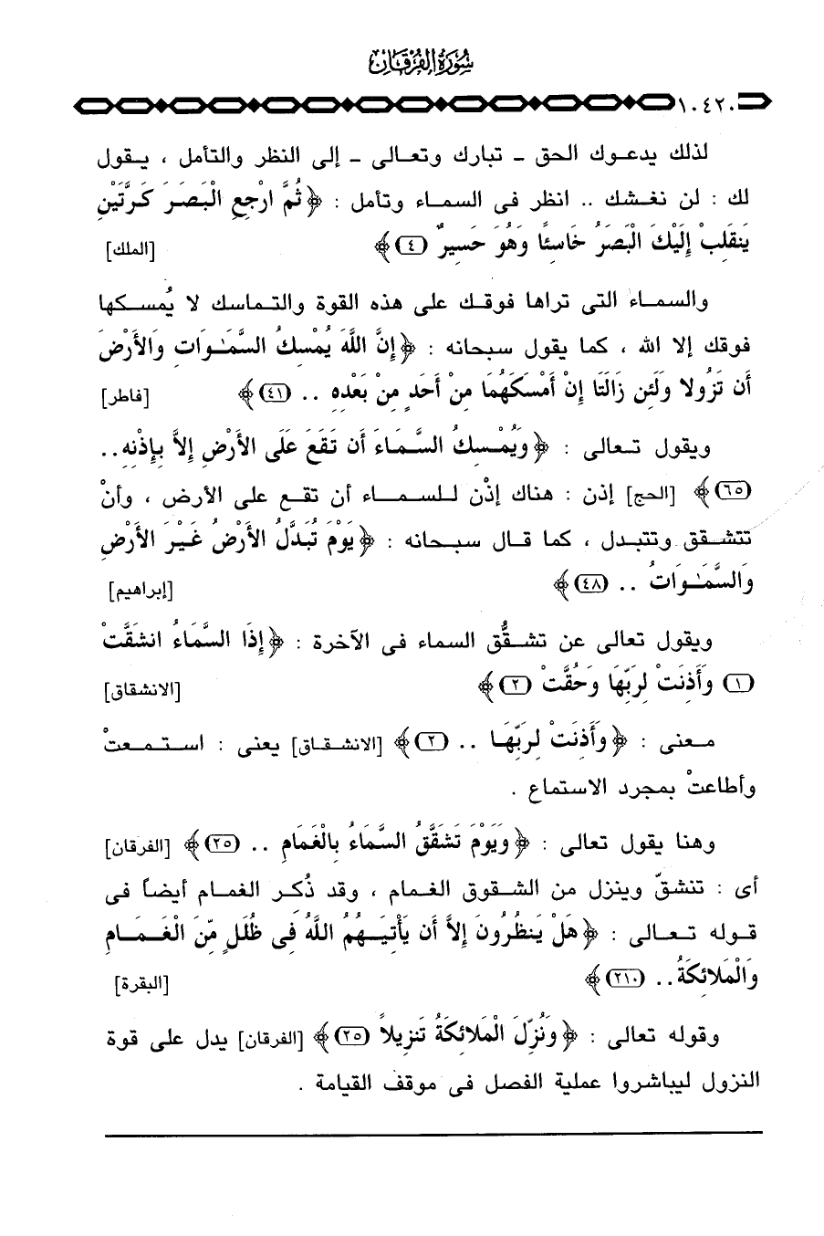 وهنا يقول تعالى: {وَيَوْمَ تَشَقَّقُ السمآء بالغمام} [الفرقان: 25] أي: تنشقّ وينزل من الشقوق الغمام، وقد ذُكِر الغمام أيضاً في قوله تعالى: {هَلْ يَنظُرُونَ إِلاَّ أَن يَأْتِيَهُمُ الله فِي ظُلَلٍ مِّنَ الغمام والملائكة} [البقرة: 210] .