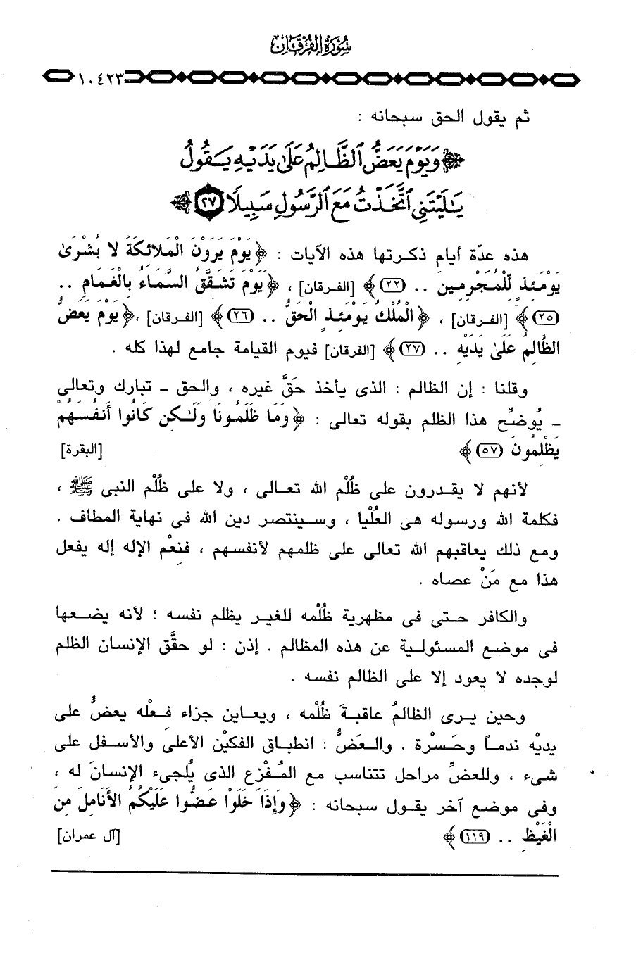 هذه عدّة أيام ذكرتها هذه الآيات: {يَوْمَ يَرَوْنَ الملائكة لاَ بشرى يَوْمَئِذٍ لِّلْمُجْرِمِينَ} [الفرقان: 22] ، {وَيَوْمَ تَشَقَّقُ السمآء بالغمام} [الفرقان: 25] ، {الملك يَوْمَئِذٍ الحق} [الفرقان: 26] ، {وَيَوْمَ يَعَضُّ الظالم على يَدَيْهِ} [الفرقان: 27] فيوم القيامة جامع لهذا كله.