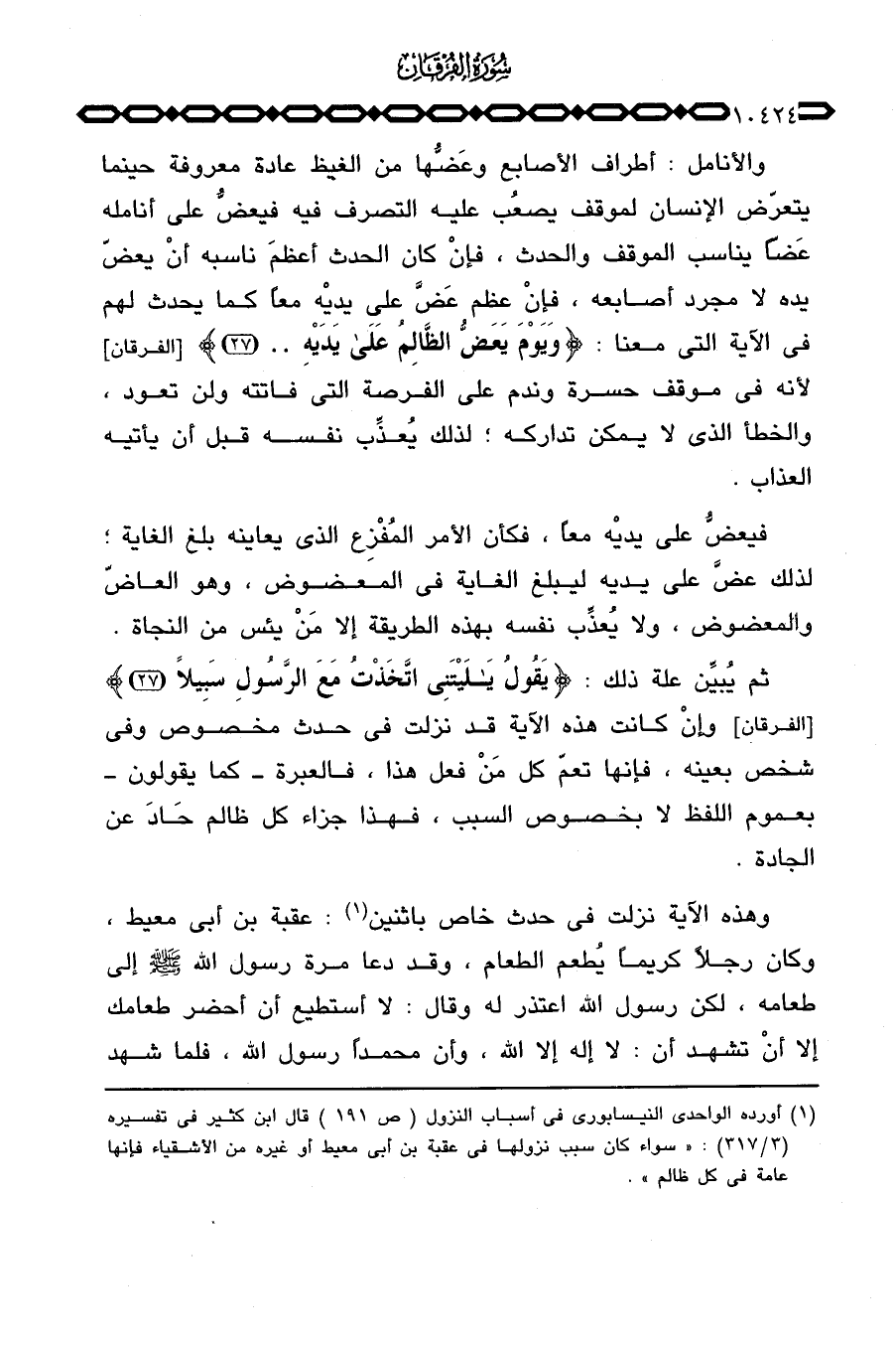 وهذه الآية «نزلت في حدث خاص باثنين: عقبة بن أبي معيط، وكان رجلاً كريماً يُطعم الطعام، وقد دعا مرة رسول الله صَلَّى اللَّهُ عَلَيْهِ وَسَلَّم َ إلى طعامه، لكن رسول الله اعتذر له وقال: لا أستطيع أن أحضر طعامك إلا أنْ تشهد أن: لا إله إلا الله، وأن محمداً رسول الله، فلما شهد
