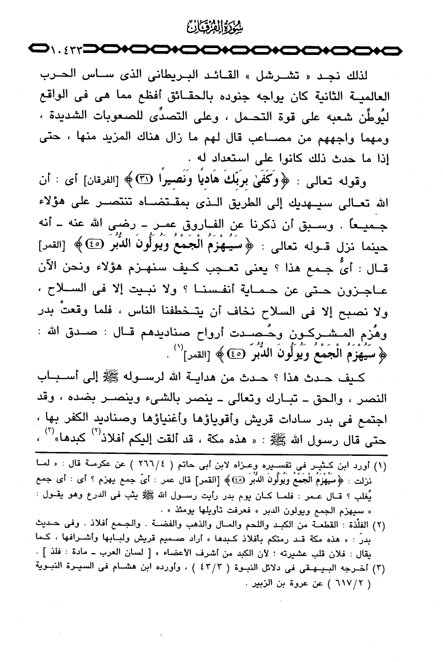 وقوله تعالى: {وكفى بِرَبِّكَ هَادِياً وَنَصِيراً} [الفرقان: 31] أي: أن الله تعالى سيهديك إلى الطريق الذي بمقتضاه تنتصر على هؤلاء جميعاً. وسبق أن ذكرنا عن الفاروق عمر رَضِيَ اللَّهُ عَنْه أنه حينما نزل قوله تعالى: {سَيُهْزَمُ الجمع وَيُوَلُّونَ الدبر} [القمر: 45] قال: أيُّ جمع هذا؟ يعني تعجب كيف سنهزم هؤلاء ونحن الآن عاجزون حتى عن حماية أنفسنا؟ ولا نبيت إلا في السلاح، ولا نصبح إلا في السلاح نخاف أن يتخطفنا الناس، فلما وقعتْ بدر وهُزِم المشركون وحُصدت أرواح صناديدهم قال: صدق الله: {سَيُهْزَمُ الجمع وَيُوَلُّونَ الدبر} [القمر: 45] .