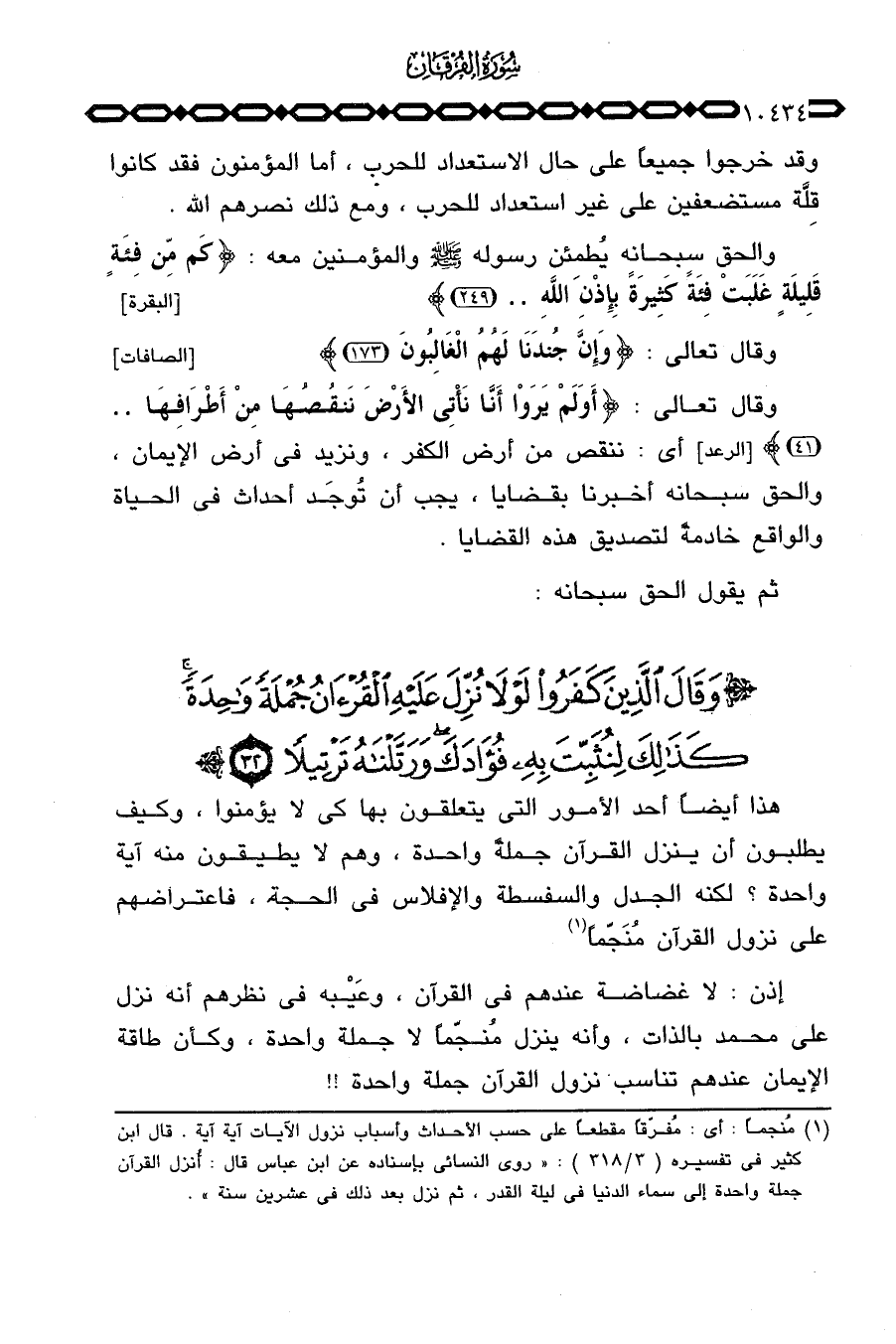 هذا أيضاً أحد الأمور التي يتعلقون بها كي لا يؤمنوا، وكيف يطلبون أن ينزل القرآن جملةً واحدة، وهم لا يطيقون منه آية واحدة؟ لكنه الجدل والسفسطة والإفلاس في الحجة، فاعتراضهم على نزول القرآن مُنَجّماً.