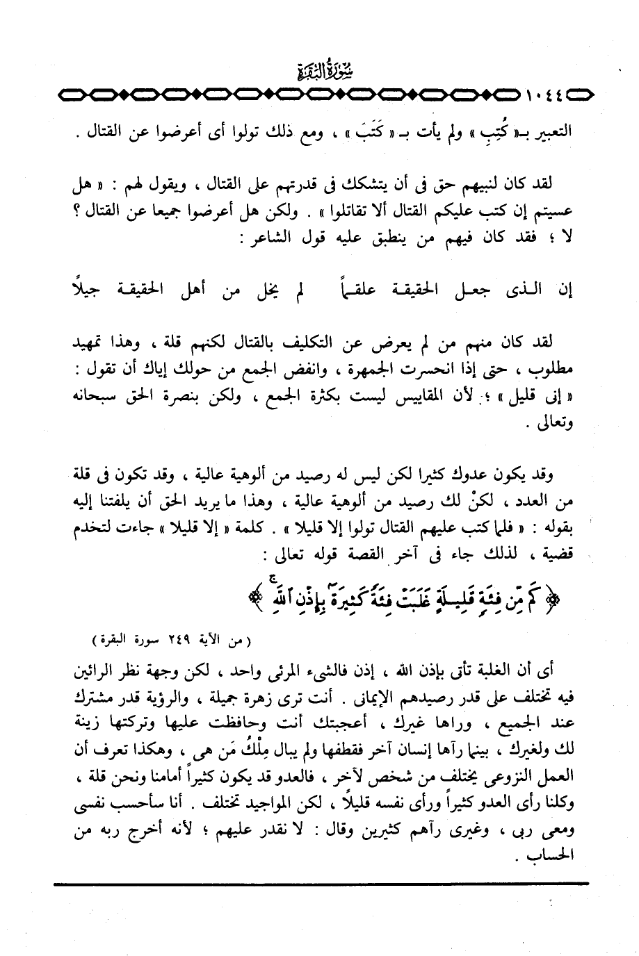 وقد يكون عدوك كثيراً لكن ليس له رصيد من ألوهية عالية، وقد تكون في قلة من العدد، لكن لك رصيد من ألوهية عالية، وهذا ما يريد الحق أن يلفتنا إليه بقوله: {فَلَمَّا كُتِبَ عَلَيْهِمُ القتال تَوَلَّوْاْ إِلاَّ قَلِيلاً} . كلمة {إِلاَّ قَلِيلاً} جاءت لتخدم قضية، لذلك جاء في آخر القصة قوله تعالى: {كَم مِّن فِئَةٍ قَلِيلَةٍ غَلَبَتْ فِئَةً كَثِيرَةً بِإِذْنِ الله} [البقرة: 249]