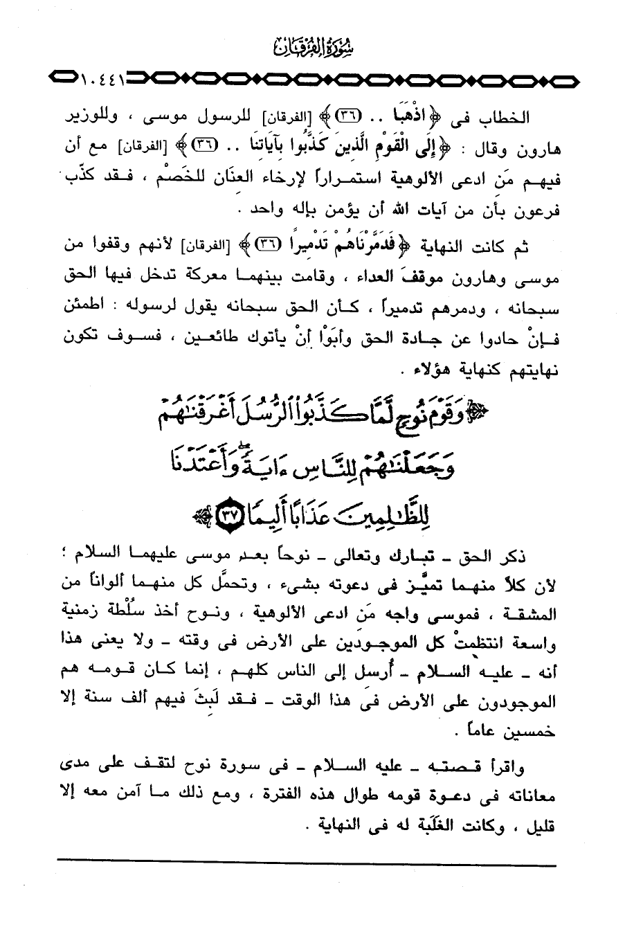 ثم كانت النهاية {فَدَمَّرْنَاهُمْ تَدْمِيراً} [الفرقان: 36] لأنهم وقفوا من موسى وهارون موقفَ العداء، وقامت بينهما معركة تدخل فيها الحق سبحانه، ودمرهم تدميراً، كأن الحق سبحانه يقول لرسوله: اطمئن فإنْ حادوا عن جادة الحق وأبَوْا أنْ يأتوك طائعين، فسوف تكون نهايتهم كنهاية هؤلاء. {وَقَوْمَ نُوحٍ لَّمَّا كَذَّبُواْ الرسل}