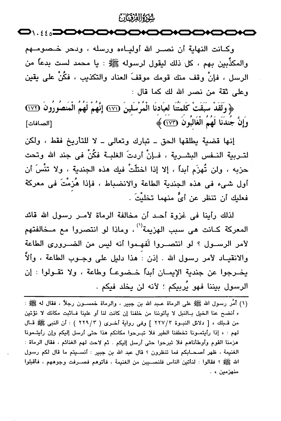 إنها قضية يطلقها الحق تبارك وتعالى لا للتاريخ فقط، ولكن لتربية النفس البشرية، فإنْ أردتَ الغلبة فكُنْ في جند الله وتحت حزبه، ولن تُهزَم أبداً، إلا إذا اختلّتْ فيك هذه الجندية، ولا تنْسَ أن أول شيء في هذه الجندية الطاعة والانضباط، فإذا هُزِمْتَ في معركة فعليك أن تنظر عن أيٍّ منهما تخليْتَ.