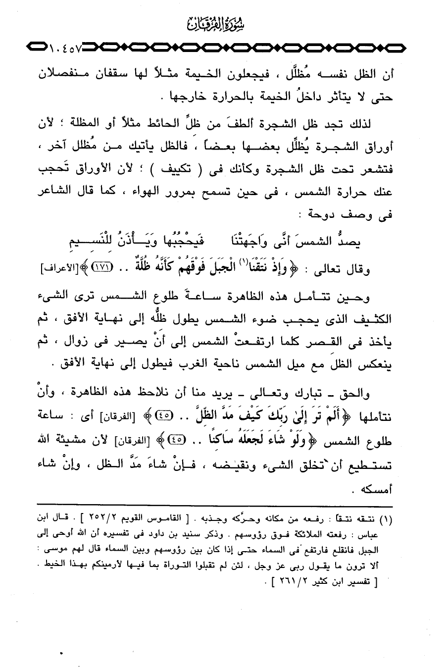 والحق تبارك وتعالى يريد منا أن نلاحظ هذه الظاهرة، وأنْ نتأملها {أَلَمْ تَرَ إلى رَبِّكَ كَيْفَ مَدَّ الظل} [الفرقان: 45] أي: ساعة طلوع الشمس {وَلَوْ شَآءَ لَجَعَلَهُ سَاكِناً} [الفرقان: 45] لأن مشيئة الله تستطيع أن تخلق الشيء ونقيضه، فإنْ شاءَ مَدَّ الظل، وإنْ شاء أمسكه.