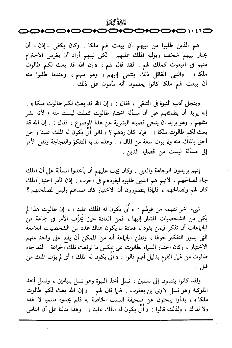 هم الذين طلبوا من نبيهم أن يبعث لهم ملكا. وكان يكفي إذن أن يختار نبيهم شخصا ويوليه الملك عليهم. لكن نبيهم أراد أن يغرس الاحترام منهم في المبعوث كملك لهم. لقد قال لهم: {إِنَّ الله قَدْ بَعَثَ لَكُمْ طَالُوتَ مَلِكاً} . والنبي القائل ذلك ينتمي إليهم، وهو منهم، وعندما طلبوا منه أن يبعث لهم ملكاً كانوا يعلمون أنه مأمون على ذلك.