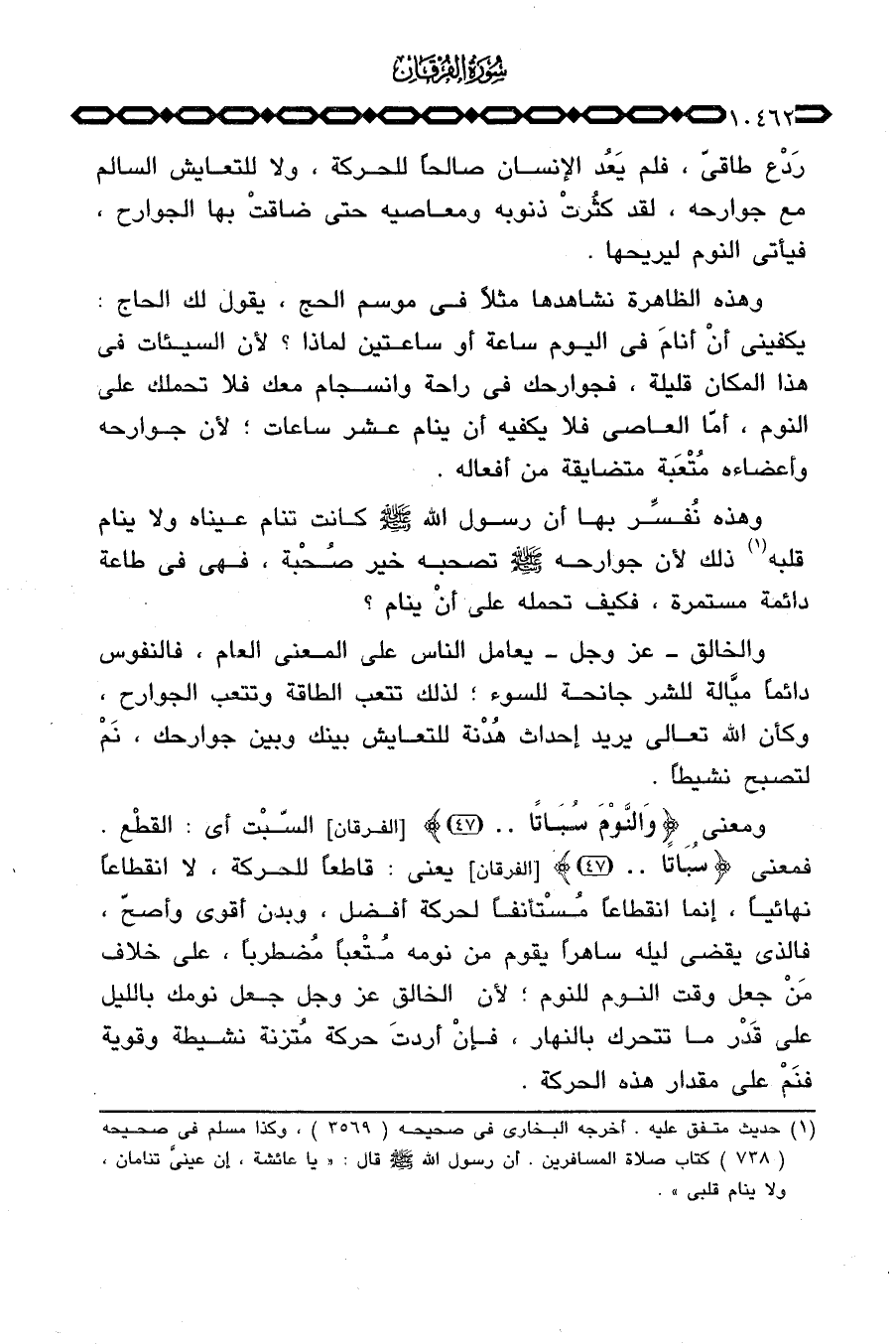 ومعنى {والنوم سُبَاتاً} [الفرقان: 47] السّبْت أي: القطْع. فمعنى {سُبَاتاً} [الفرقان: 47] يعني: قاطعاً للحركة، لا انقطاعاً نهائياً، إنما انقطاعاً مُسْتأنفاً لحركة أفضل، وبدن أقوى وأصحّ، فالذي يقضي ليله ساهراً يقوم من نومه مُتْعباً مُضطرباً، على خلاف مَنْ جعل وقت النوم للنوم؛ لأن الخالق عَزَّ وَجَلَّ جعل نومك بالليل على قَدْر ما تتحرك بالنهار، فإنْ أردتَ حركة مُتزنة نشيطة وقوية فنَمْ على مقدار هذه الحركة.