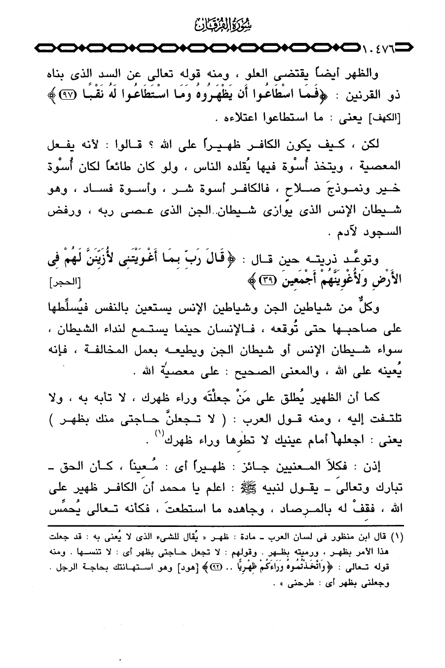 لكن، كيف يكون الكافر ظهرياً على الله؟ قالوا: لأنه يفعل المعصية، ويتخذ أُسْوة فيها يُقلده الناس، ولو كان طائعاً لكان أُسْوة خير ونموذجَ صلاحٍ، فالكافر أسوة شر، وأسوة فساد، وهو شيطان الإنس الذي يوازي شيطان الجن الذي عصى ربه، ورفض السجود لآدم.