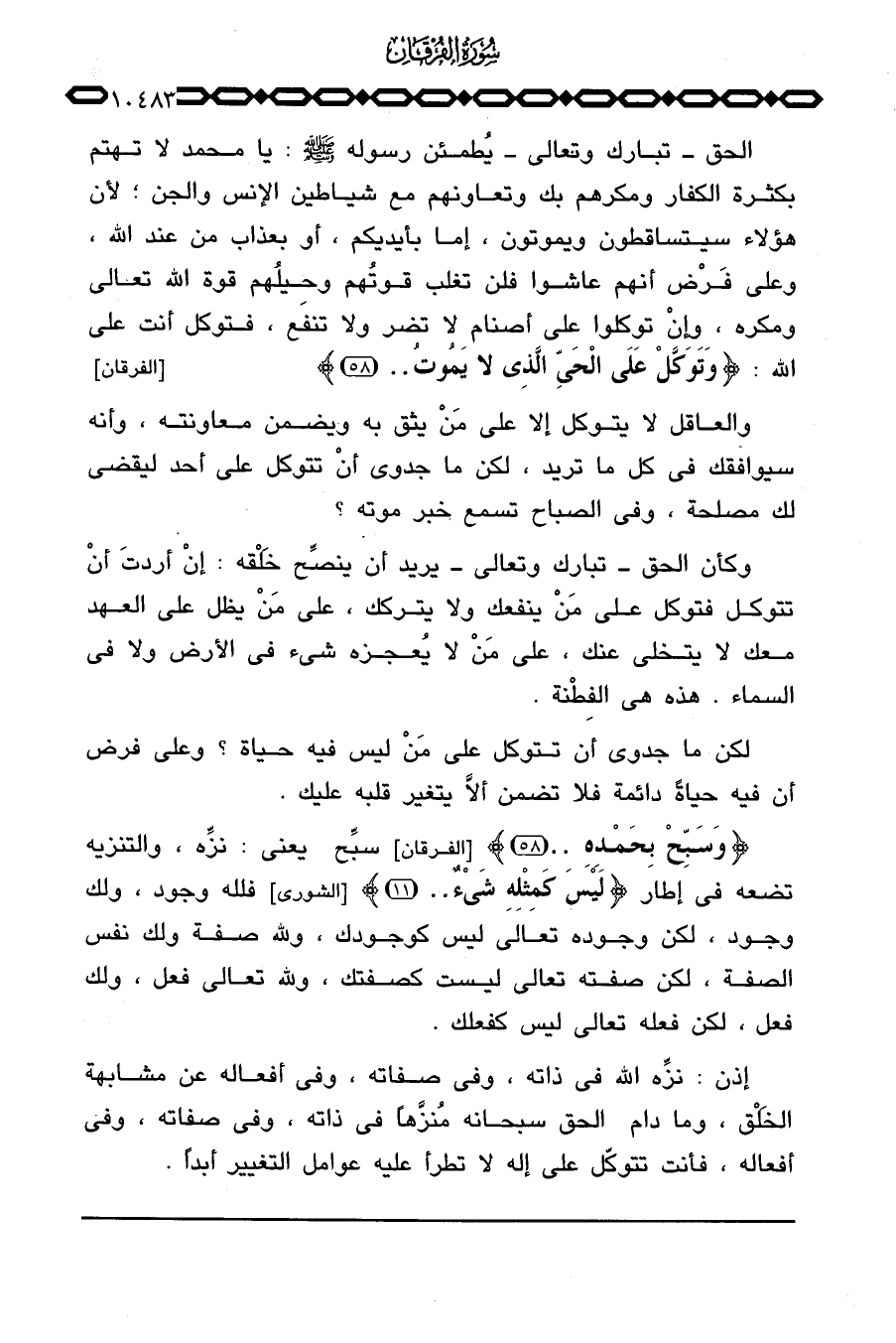 إذن: نزَّه الله في ذاته، وفي صفاته، وفي أفعاله عن مشابهة الخَلْق، وما دام الحق سبحانه مُنزَّهاً في ذاته، وفي صفاته، وفي أفعاله، فأنت تتوكّل على إله لا تطرأ عليه عوامل التغيير أبداً.