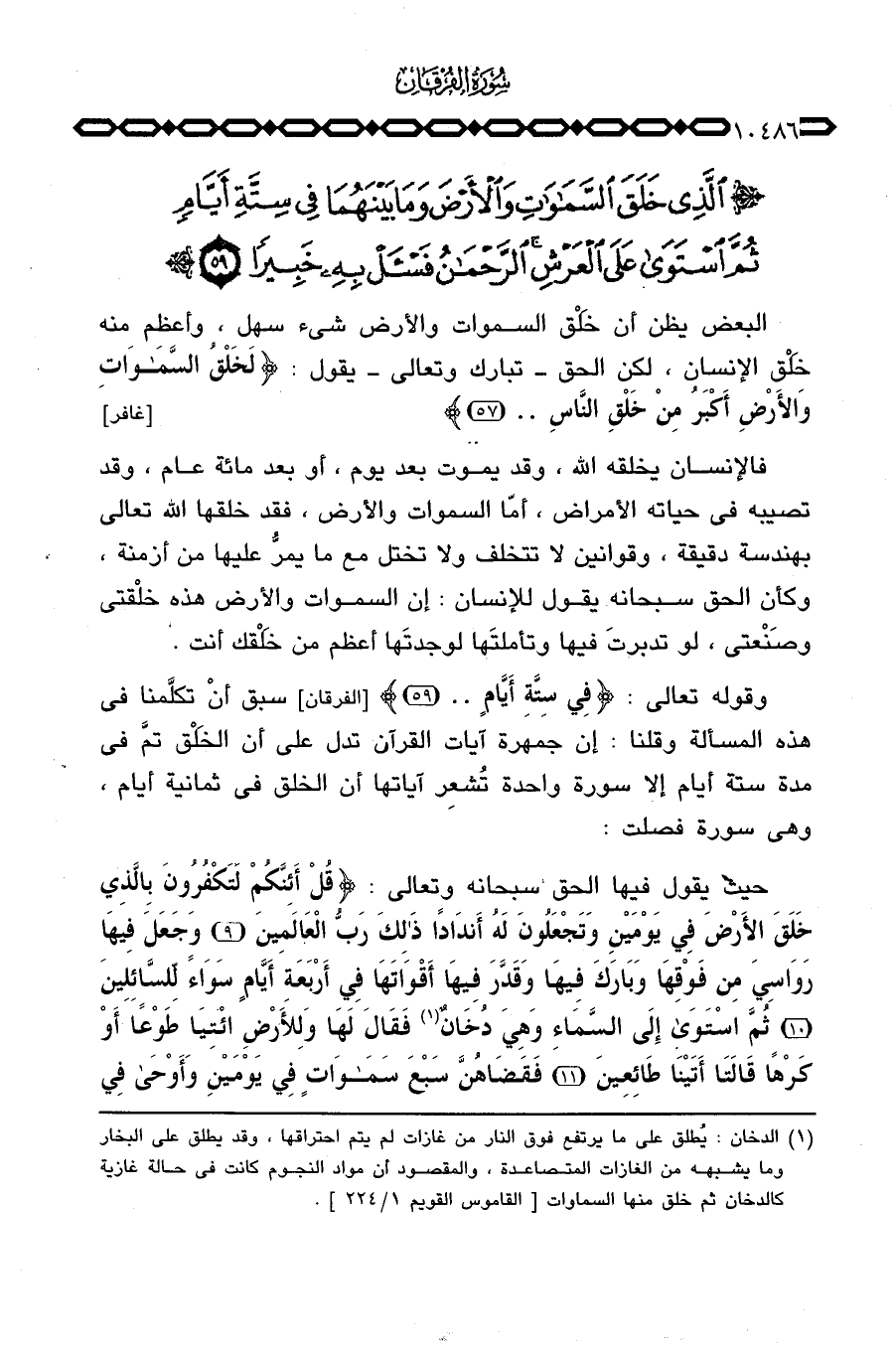 وقوله تعالى: {فِي سِتَّةِ أَيَّامٍ} [الفرقان: 59] سبق أن تكلَّمنا في هذه المسألة وقلنا: إن جمهرة آيات القرآن تدل على أن الخَلْق تمَّ في مدة ستة أيام إلا سورة واحدة تُشعِر آياتها أن الخلق في ثمانية أيام، وهي سورة فصلت.