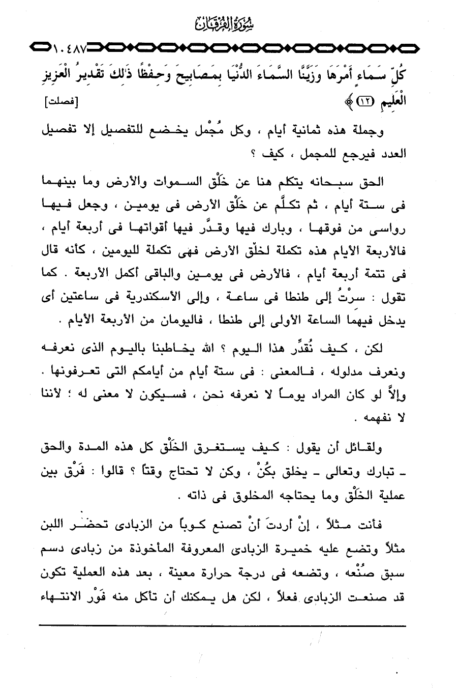 الحق سبحانه يتكلم هنا عن خَلْق السموات والأرض وما بينهما في ستة أيام، ثم تكلَّم عن خَلْق الأرض في يومين، وجعل فيها رواسي من فوقها، وبارك فيها وقدَّر فيها أقواتها في أربعة أيام، فالأربعة الأيام هذه تكملة لخلّق الأرض فهي تكملة لليومين، كأنه قال في تتمة أربعة أيام، فالأرض في يومين والباقي أكمل الأربعة. كما تقول: سِرْتُ إلى طنطا في ساعة، وإلى الأسكندرية في ساعتين أي يدخل فيهما الساعة الأولى إلى طنطا، فاليومان من الأربعة الأيام.