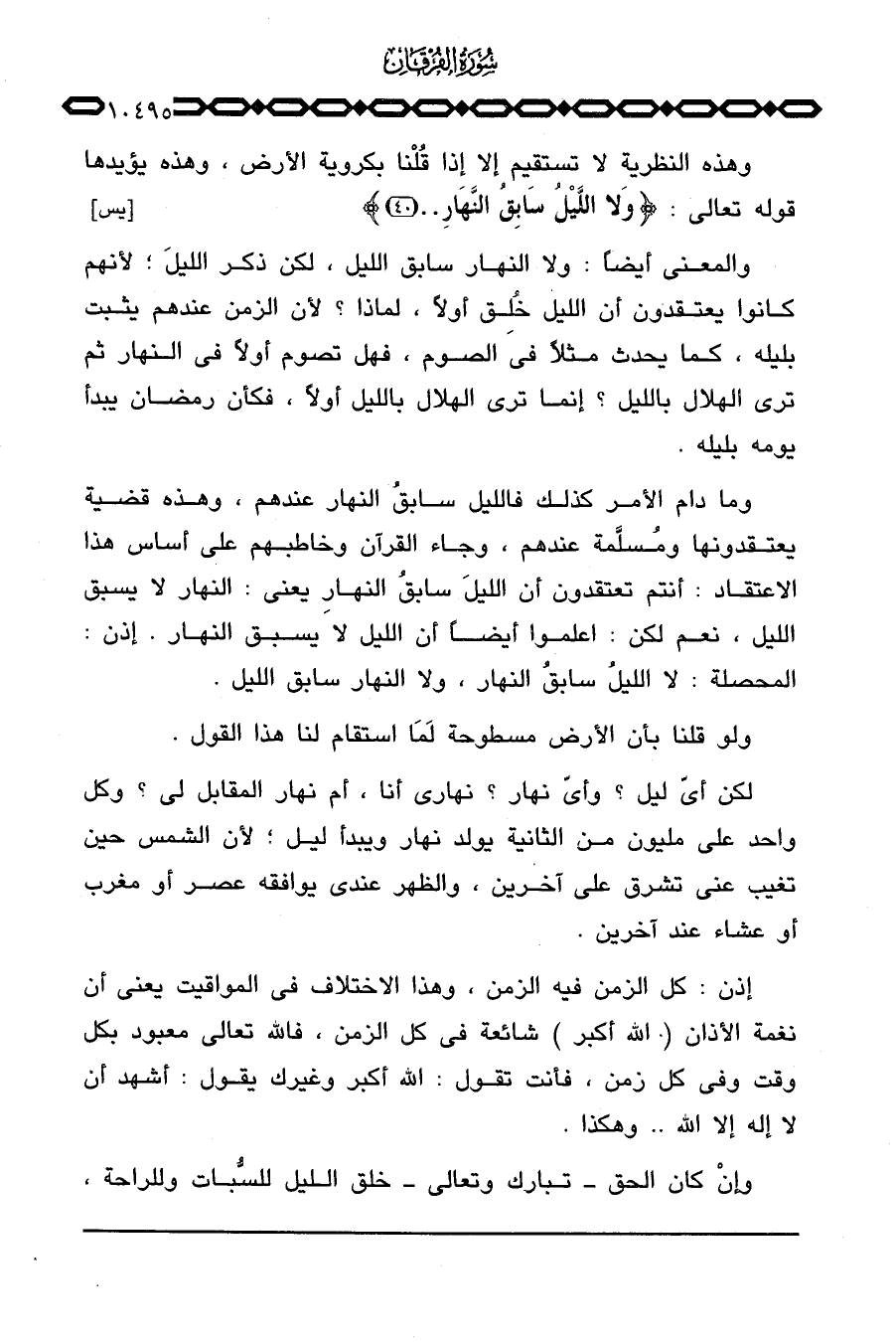 وما دام الأمر كذلك فالليل سابقُ النهار عندهم، وهذه قضية يعتقدونها ومُسلَّمة عندهم، وجاء القرآن وخاطبهم على أساس هذا الاعتقاد: أنتم تعتقدون أن الليلَ سابقُ النهار يعني: النهار لا يسبق الليل، نعم لكن: اعلموا أيضاً أن الليل لا يسبق النهار. إذن: المحصلة: لا الليلُ سابقُ النهار، ولا النهار سابق الليل.