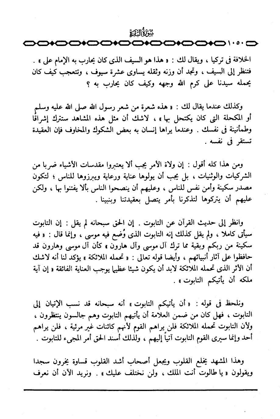 الخلافة في تركيا، ويقال لك: «هذا هو السيف الذي كان يحارب به الإمام علي» . فتنظر إلى السيف، وتجد أن وزنه وثقله يساوي عشرة سيوف، وتتعجب كيف كان يحمله سيدنا علي كرم الله وجهه وكيف كان يحارب به.