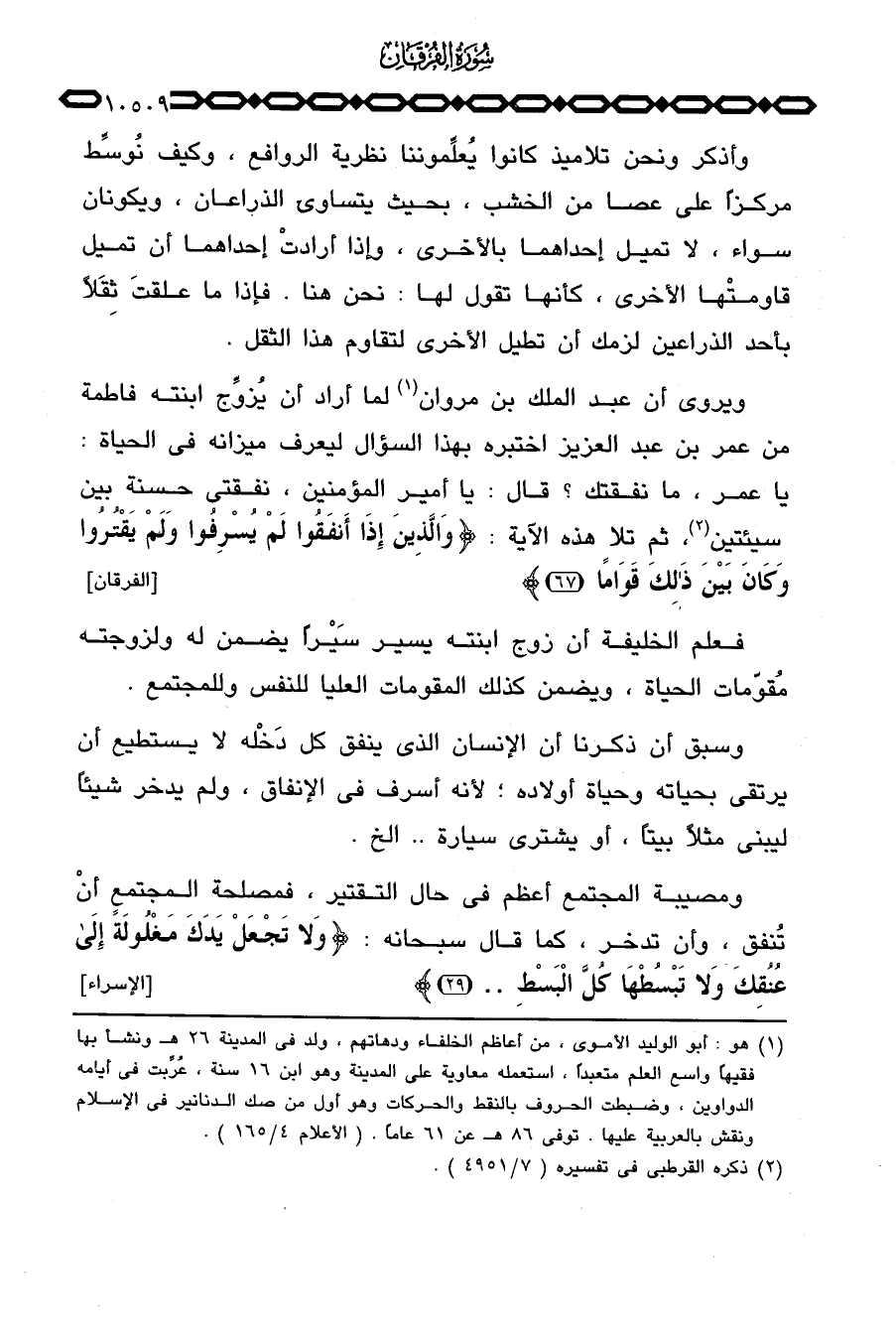ويروي أن عبد الملك بن مروان لما أراد أن يُزوِّج ابنته فاطمة من عمر بن عبد العزيز اختبره بهذا السؤال ليعرف ميزانه في الحياة: يا عمر، ما نفقتك؟ قال: يا أمير المؤمنين، نفقتي حسنة بين سيئتين، ثم تلا هذه الآية: {والذين إِذَآ أَنفَقُواْ لَمْ يُسْرِفُواْ وَلَمْ يَقْتُرُواْ وَكَانَ بَيْنَ ذَلِكَ قَوَاماً} [الفرقان: 67] .