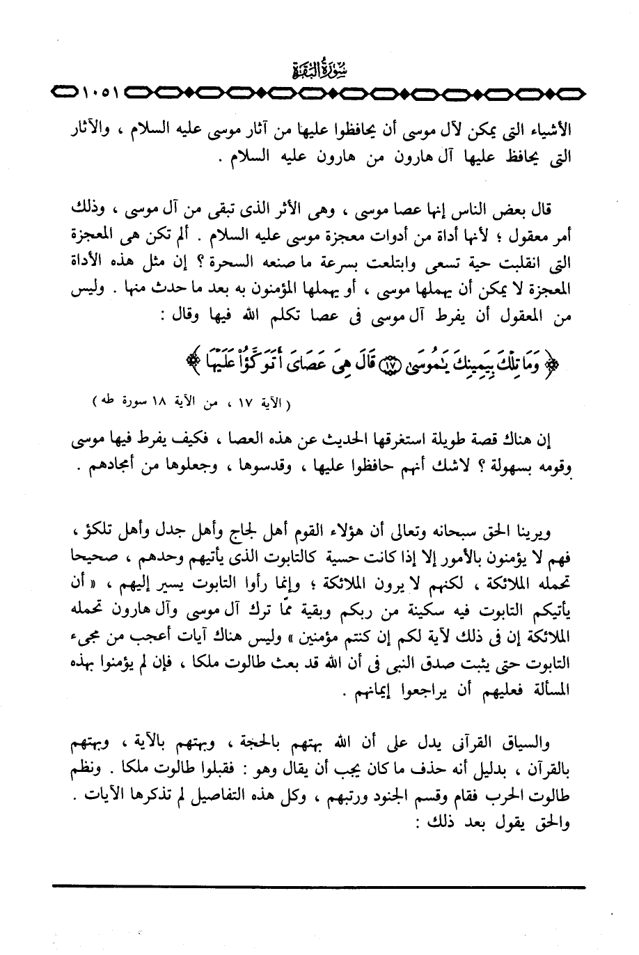 قال بعض الناس إنها عصا موسى، وهي الأثر الذي تبقى من آل موسى، وذلك أمر معقول؛ لأنها أداة من أدوات معجزة موسى عليه السلام. ألم تكن هي المعجزة التي انقلبت حية تسعى وابتلعت بسرعة ما صنعه السحرة؟ إن مثل هذه الأداة المعجزة لا يمكن أن يهملها موسى، أو يهملها المؤمنون به بعد ما حدث منها. وليس من المعقول أن يفرط آل موسى في عصا تكلم الله فيها وقال: