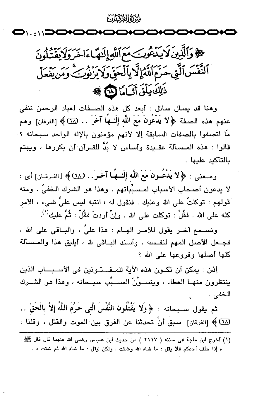 ومعنى: {لاَ يَدْعُونَ مَعَ الله إلها آخَرَ} [الفرقان: 68] أي: لا يدعون أصحاب الأسباب لمسبِّباتهم، وهذا هو الشرك الخفيّ. ومنه قولهم: توكلتُ على الله وعليك. فنقول له، انتبه ليس عليَّ شيء، الأمر كله على الله. فقُلْ: توكلت على الله. وإنْ أردتَ فقُلْ: ثُمَّ عليك.