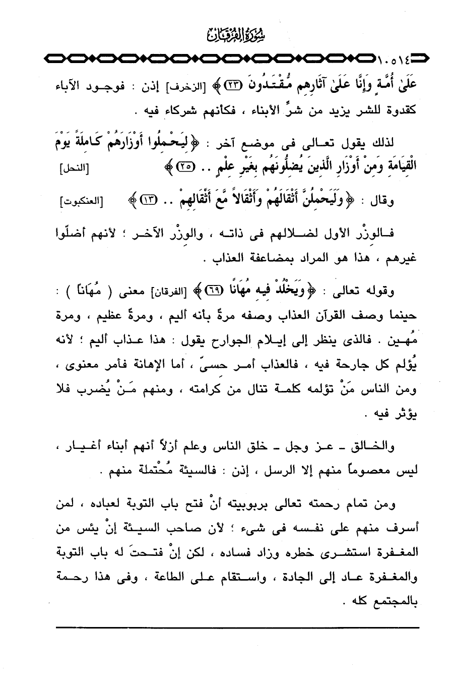 لذلك يقول الله تعالى في موضع آخر: {لِيَحْمِلُواْ أَوْزَارَهُمْ كَامِلَةً يَوْمَ القيامة وَمِنْ أَوْزَارِ الذين يُضِلُّونَهُمْ بِغَيْرِ عِلْمٍ} [النحل: 25] .