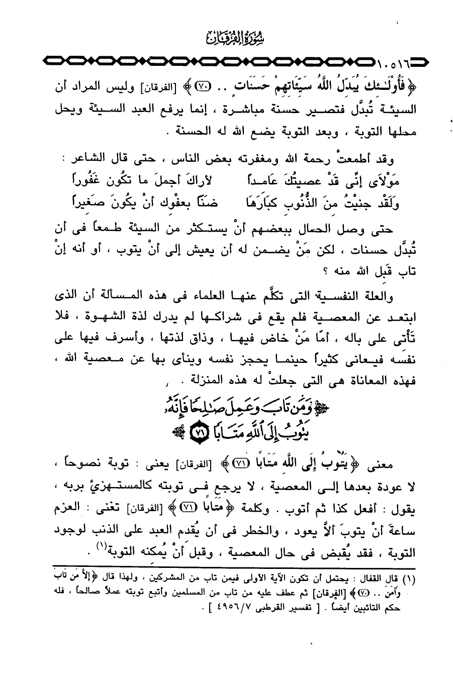 معنى {يَتُوبُ إِلَى الله مَتاباً} [الفرقان: 71] يعني: توبة نصوحاً، لا عودة بعدها إلى المعصية، لا يرجع في توبته كالمستهزيء بربه، يقول: أفعل كذا ثم أتوب، وكلمة {مَتاباً} [الفرقان: 71] تعني: العزم ساعةَ أنْ يتوبَ ألاَّ يعود، والخطر في أن يُقدِم العبد على الذنب لوجود التوبة، فقد بُقبض في حال المعصية، وقبل أنْ يُمِكنه التوبة.