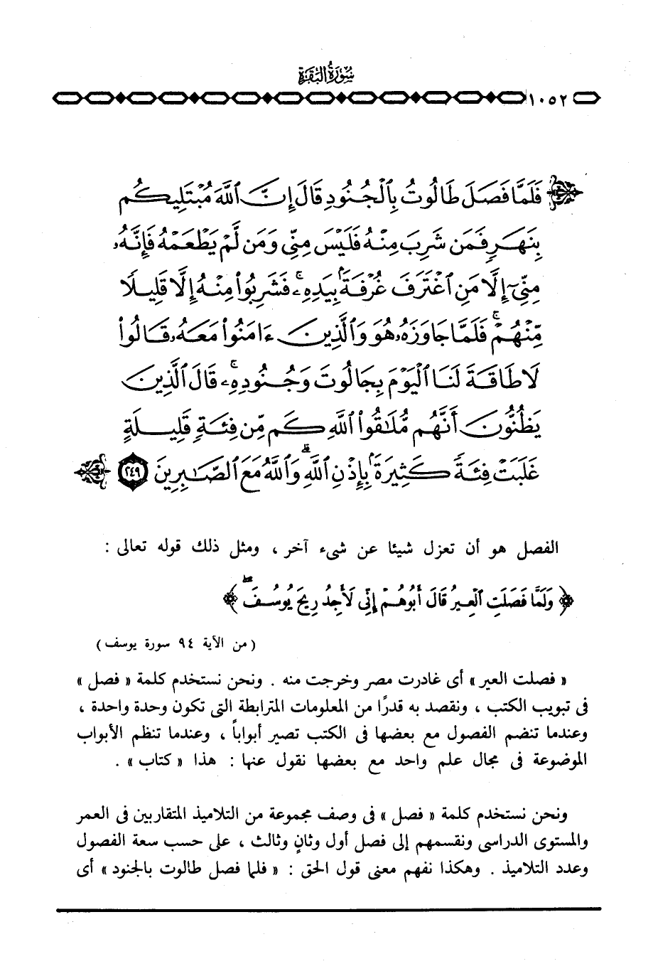 ونحن نستخدم كلمة «فصل» في وصف مجموعة من التلاميذ المتقاربين في العمر والمستوى الدراسي ونقسمهم إلى فصل أول وثانٍ وثالث، على حسب سعة الفصول وعدد التلاميذ. وهكذا نفهم معنى قول الحق: {فَلَمَّا فَصَلَ طَالُوتُ بالجنود} أي