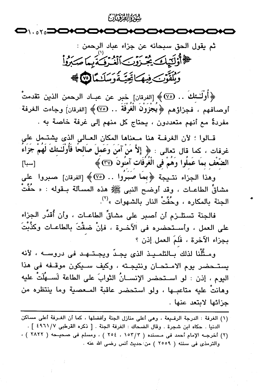 {أولئك} [الفرقان: 75] خبر عن عباد الرحمن الذين تقدمتْ أوصافهم، فجزاؤهم {يُجْزَوْنَ الغرفة} [الفرقان: 75] وجاءت الغرفة مفردةً مع أنهم متعددون، يحتاج كل منهم إلى غرفة خاصة به.