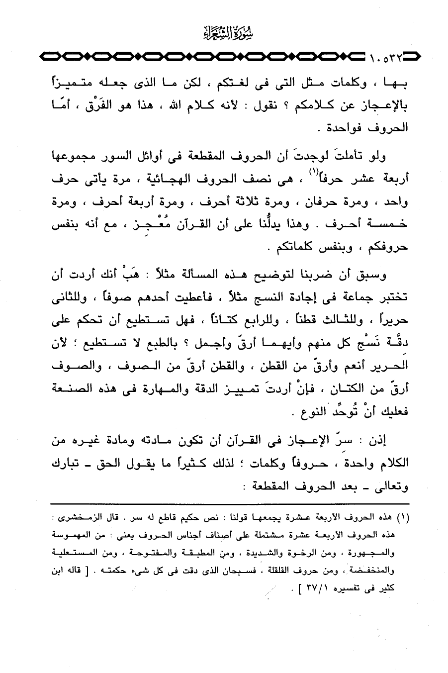 ولو تأملتَ لوجدتَ أن الحروف المقطعة في أوائل السور مجموعها أربعة عشر حرفاً، هي نصف الحروف الهجائية، مرة يأتي حرف واحد، ومرة حرفان، ومرة ثلاثة أحرف، ومرة أربعة أحرف، ومرة خمسة أحرف. وهذا يدُّلنا على أن القرآن مُعْجِز، مع أنه بنفس حروفكم، وبنفس كلماتكم.