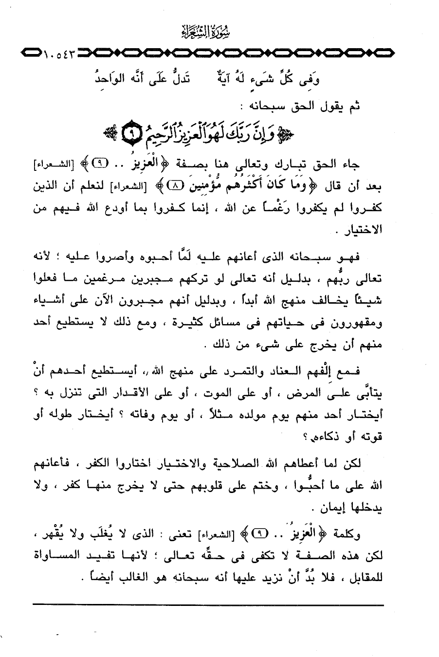 جاء الحق تبارك وتعالى هنا بصفة {العزيز} [الشعراء: 9] بعد أن قال {وَمَا كَانَ أَكْثَرُهُمْ مُّؤْمِنِينَ} [الشعراء: 8] لنعلم أن الذين كفروا لم يكفروا رَغْماً عن الله، إنما كفروا بما أودع الله فيهم من الاختيار.