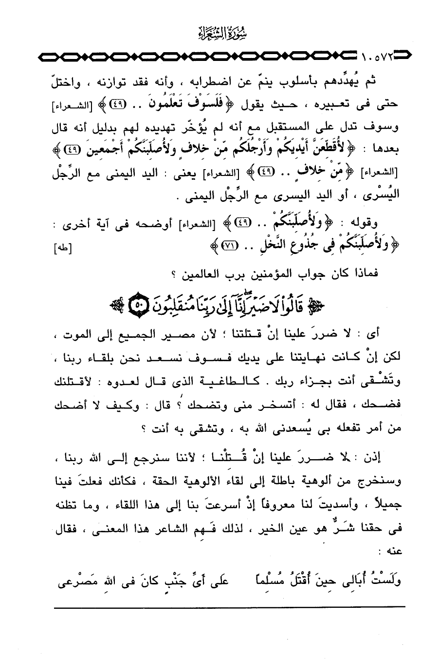 إذن: لا ضررَ علينا إنْ قُتِلْنا؛ لأننا سنرجع إلى الله ربنا، وسنخرج من ألوهية باطلة إلى لقاء الألوهية الحقة، فكأنك فعلتَ فينا جميلاً، وأسديتَ لنا معروفاً إذْ أسرعتَ بنا إلى هذا اللقاء، وما تظنه في حقنا شَرٌّ هو عين الخير، لذلك فَهِم الشاعر هذا المعنى، فقال عنه: