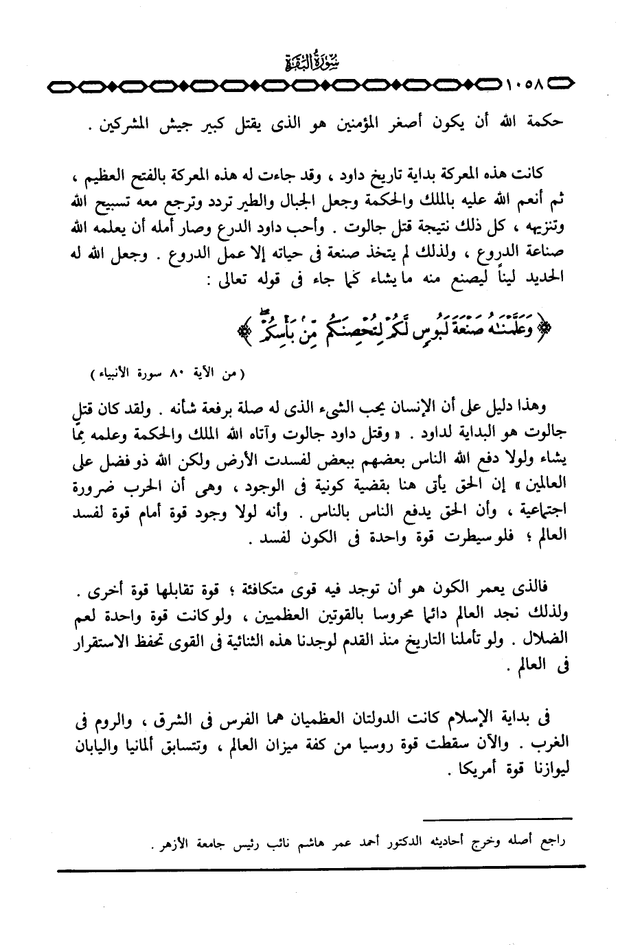 وهذا دليل على أن الإنسان يحب الشيء الذي له صلة برفعة شأنه. ولقد كان قتل جالوت هو البداية لداود. {وَقَتَلَ دَاوُدُ جَالُوتَ وَآتَاهُ الله الملك والحكمة وَعَلَّمَهُ مِمَّا يَشَآءُ وَلَوْلاَ دَفْعُ الله الناس بَعْضَهُمْ بِبَعْضٍ لَفَسَدَتِ الأرض ولكن الله ذُو فَضْلٍ عَلَى العالمين} إن الحق يأتي هنا بقضية كونية في الوجود، وهي أن الحرب ضرورة اجتماعية، وأن الحق يدفع الناس بالناس. وأنه لولا وجود قوة أمام قوة لفسد العالم؛ فلو سيطرت قوة واحدة في الكون لفسد.