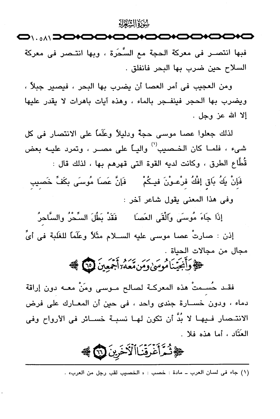 لذلك جعلوا عصا موسى حجة ودليلاً وعَلَماً على الانتصار في كل شيء، فلما كان الخصيب والياً على مصر، وتمرد عليه بعض قُطَّاع الطرق، وكانت لديه القوة التي قهرهم بها، لذلك قال: